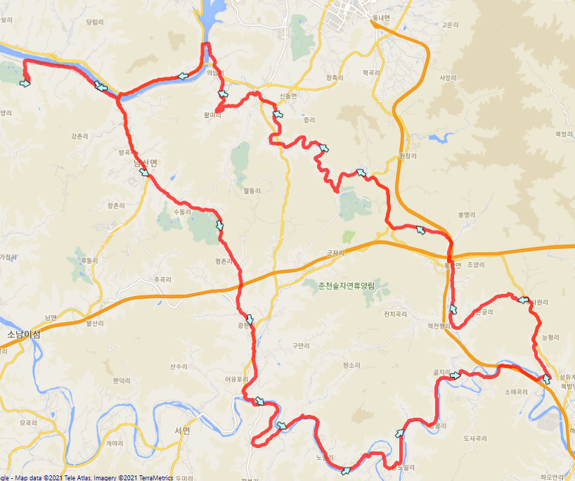 의암댐까지 달린 이후부터는 북한강 자전거길을 이용해 출발지로 복귀하면 됩니다.