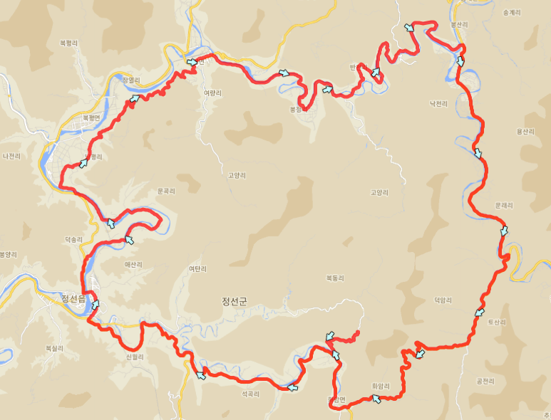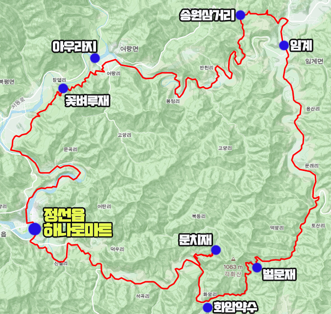 당초 정선종합운동장에서 출발할 예정이었으나 화장실이 폐쇄되어 있어 그 근처 농협하나로마트 주차장에서 출발했습니다.