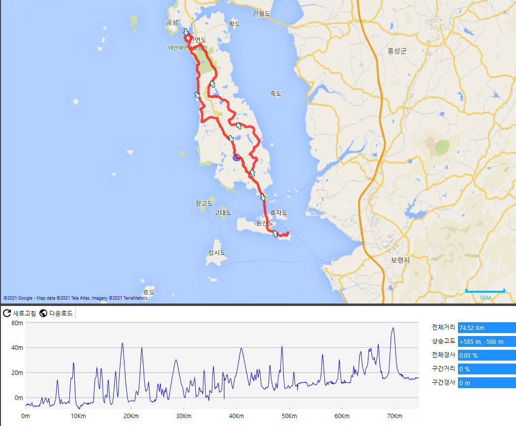 약 75km 670m의 짧은 코스지만 섬 라이딩 답게 작은 낙타등의 연속이었고 전반적으로 길은 좋고 한산해서 라이딩하기엔 좋았습니다.