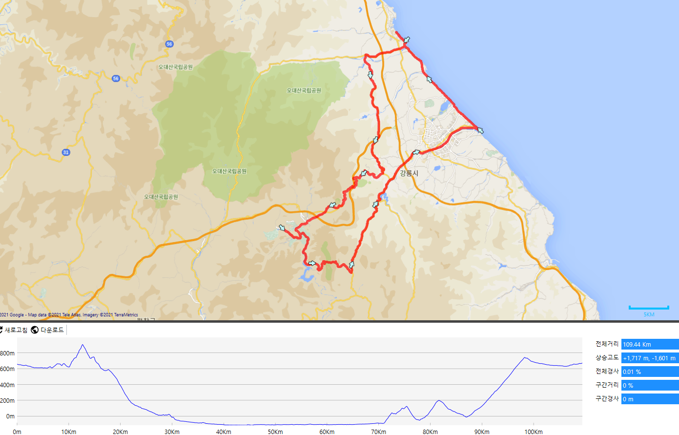 주문진 찍고 한적한 길을 이용 대관령 옛길을 오르고 출발지로 복귀하는 114km 1,800m 코스입니다.