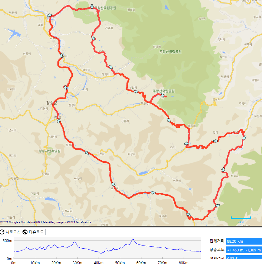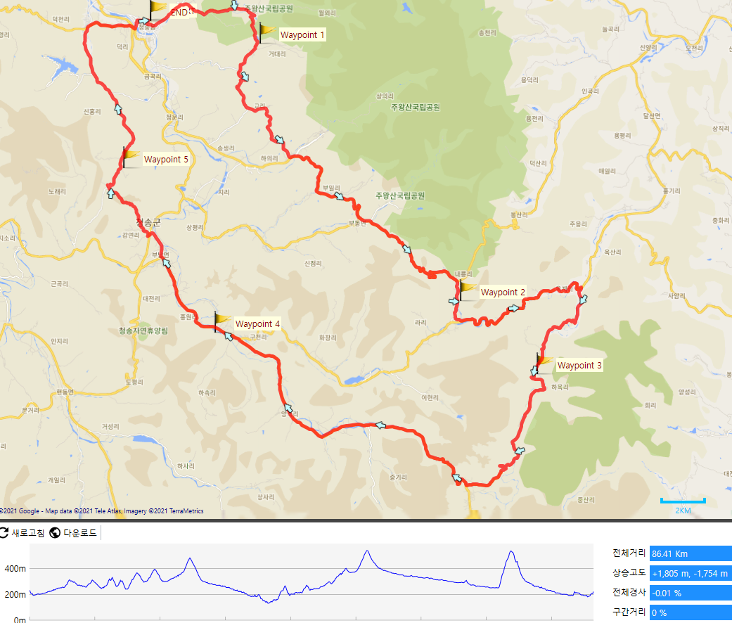 청송군청에서 출발 총 86km정도 나오며 한적한 길을 이용해서 주왕산과 주산지 앞을 지나는 코스입니다.