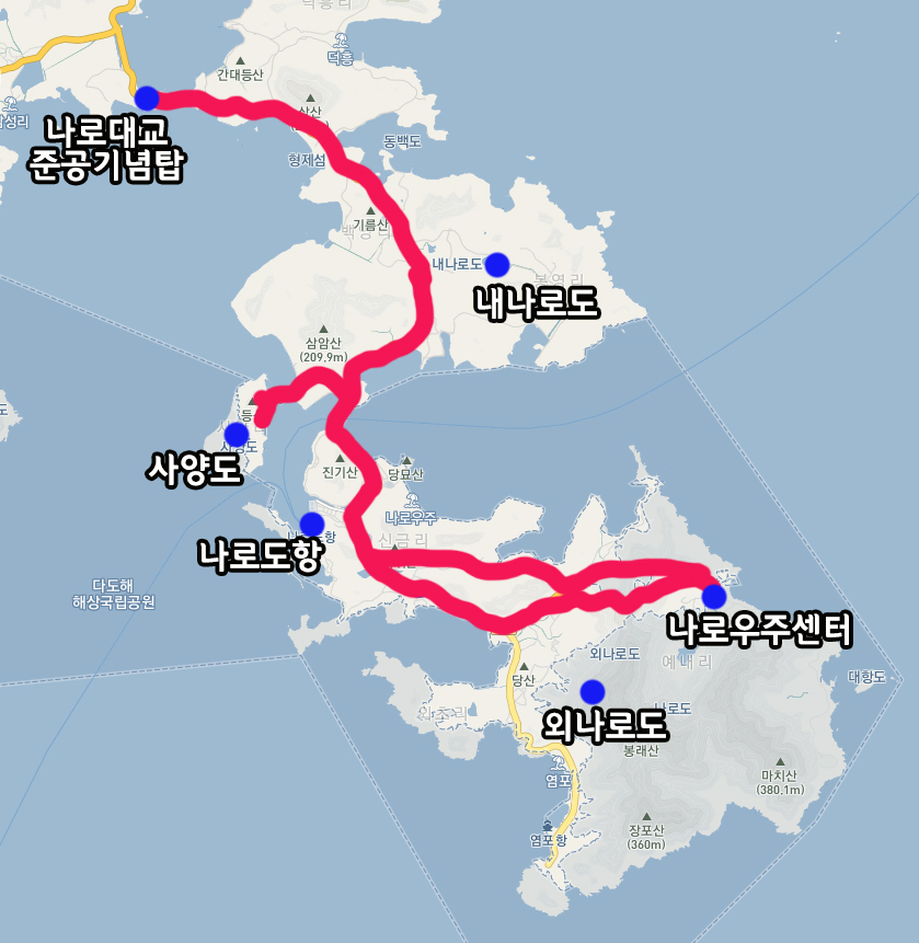 출발은 나로도 입구에 있는 나로대교완공기념탑에서 했으며 내나로도와 외나로도를 거쳐 우주센터까지 갔다가 되돌아 나오는 코스입니다.