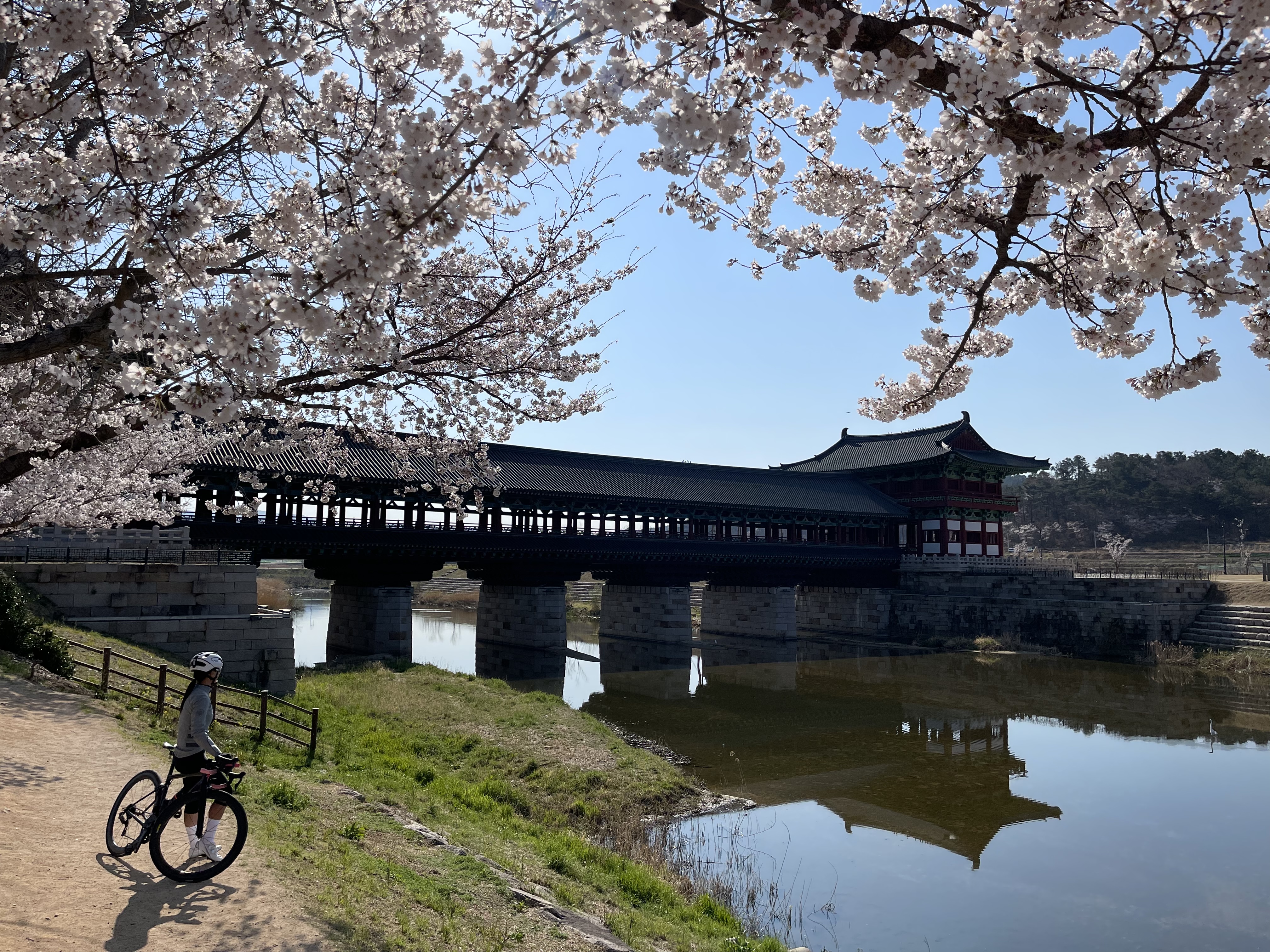 김유신장군묘 앞의 벚꽃구경을 마치면 형산강을 따라 벚꽃길을 라이딩하고 인도교를 건너 경주시내로 건너갑니다.