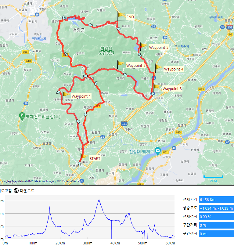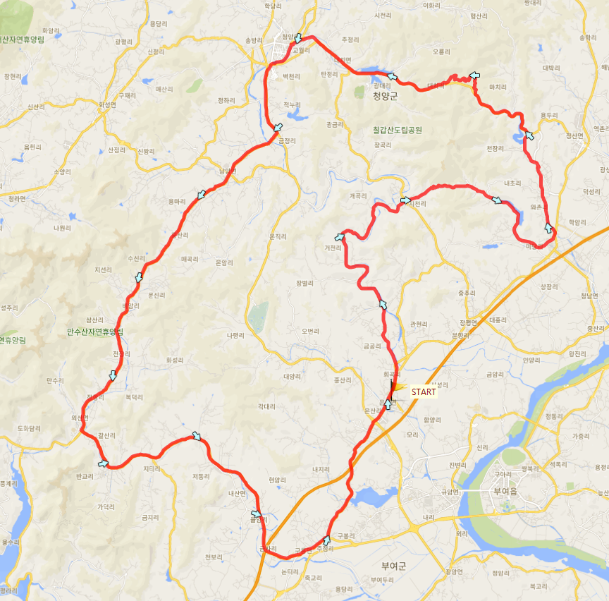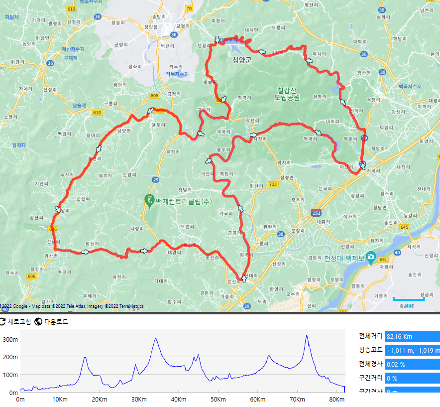위 코스에서 청양 시내구간을 빼고 칠갑산 장곡사벚꽃길을 추가해서 96km 1,100m 코스로 만들었습니다.