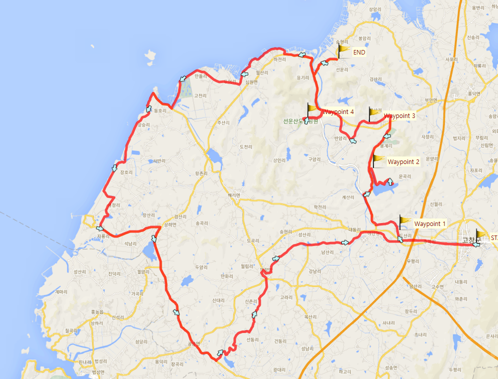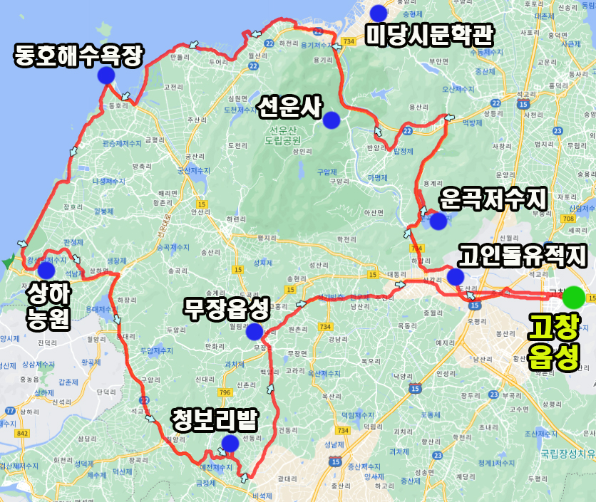 고창에서 출발하여 람사르습지로 지정된 운곡저수지를 들렀다가 선운사-미당 시문학관-상하농원-청보리밭-무장읍성들러 복귀하는 총 99km 순환코스입니다.