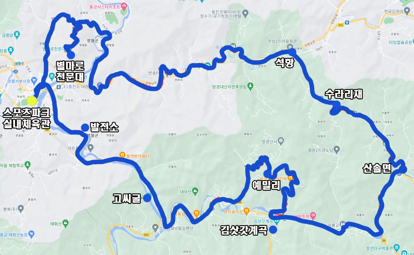 코스는 가장 많은 라이더들이 다니는 코스로 영월읍에서 출발하여 별마로천문대 먼저 오르고 반대편으로 다운힐 하여 석항천 따라 석항을 거쳐 수라리재를 오릅니다.
