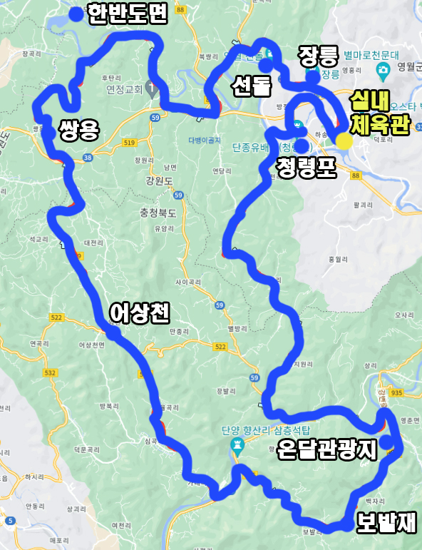 보발재 다운힐 후 어상천과 쌍용을 거쳐 한반도지형으로 유명한 한반도면을 통과해서 서강을 따라 연당으로 가고 이후 선돌을 구경하고 단종릉인 장릉 앞을 통과해 복귀하는 총 97km 1,000m의 재미있는 투어코스입니다.