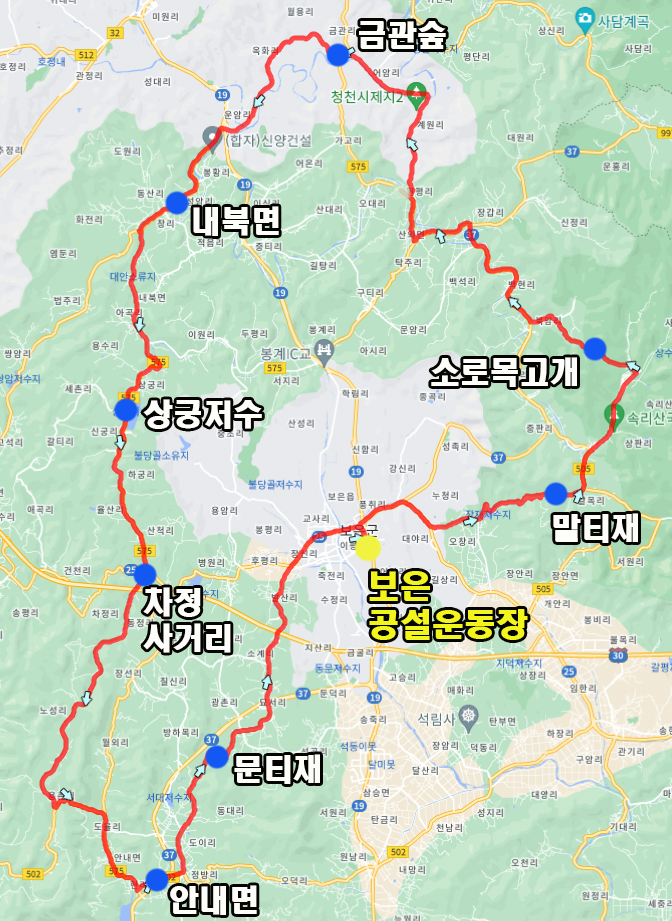 안내면을 지나고 문티재를 넘어 출발지로 복귀하는 총 87km 1,200m의 코스입니다.