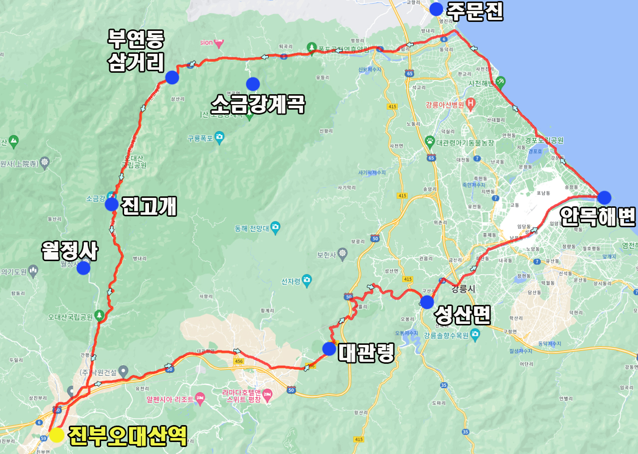 코스는 진부오대산역에서 출발해 대관령을 살짝 오르고 긴 다운힐하여 안목해변에서 커피 한잔하고 주문진방향으로 동해안 자전거길을 잠시 달리고 진고개를 오른 후 출발지로 복귀하는 총 107km 1,500m의 중간 난이도의 코스입니다.