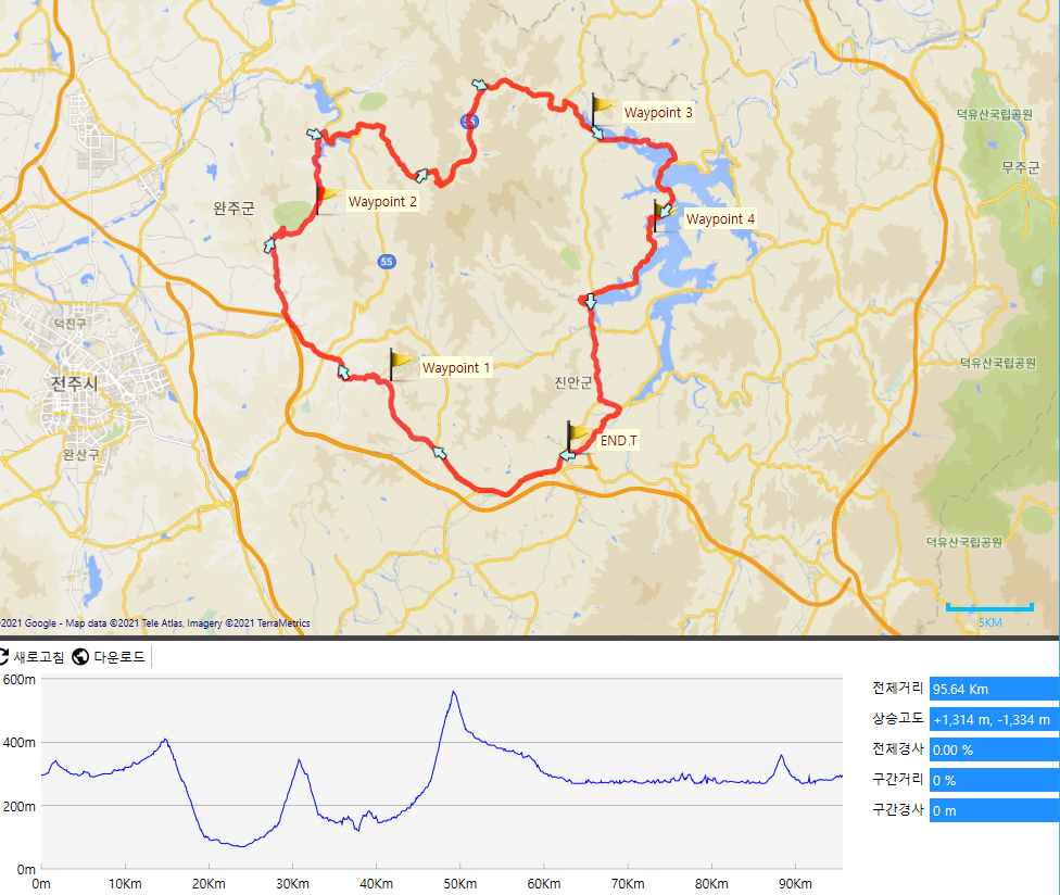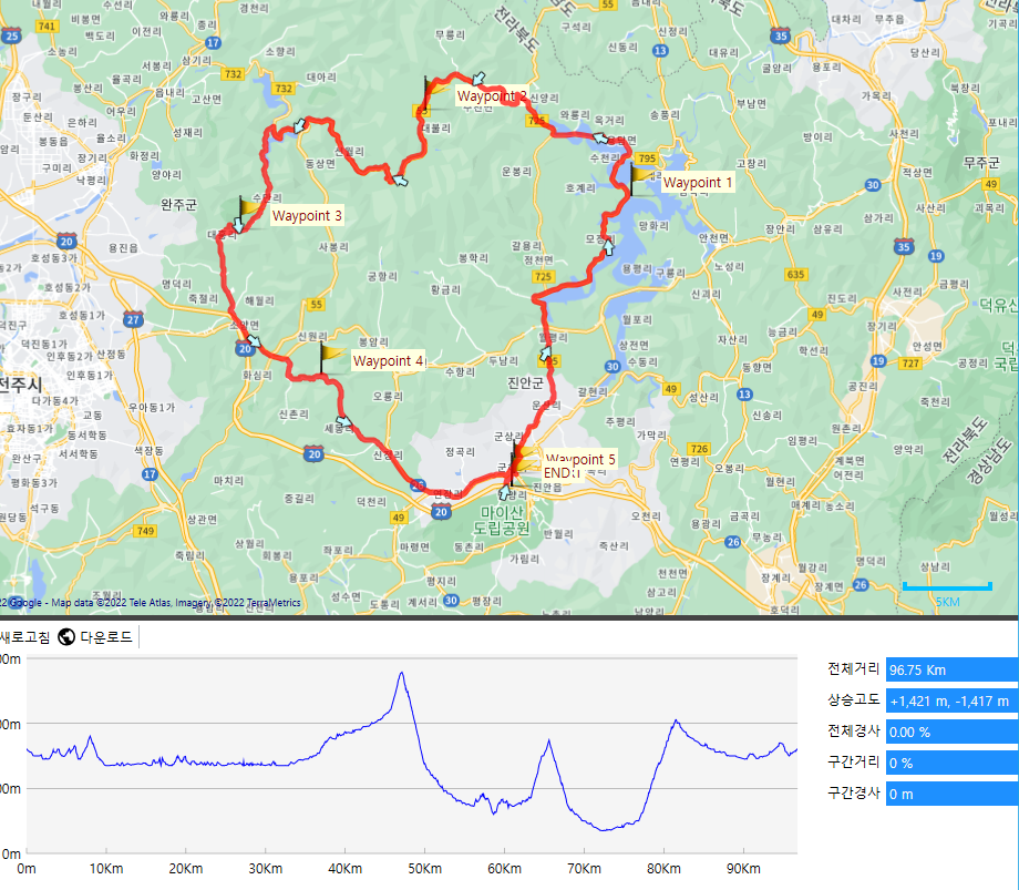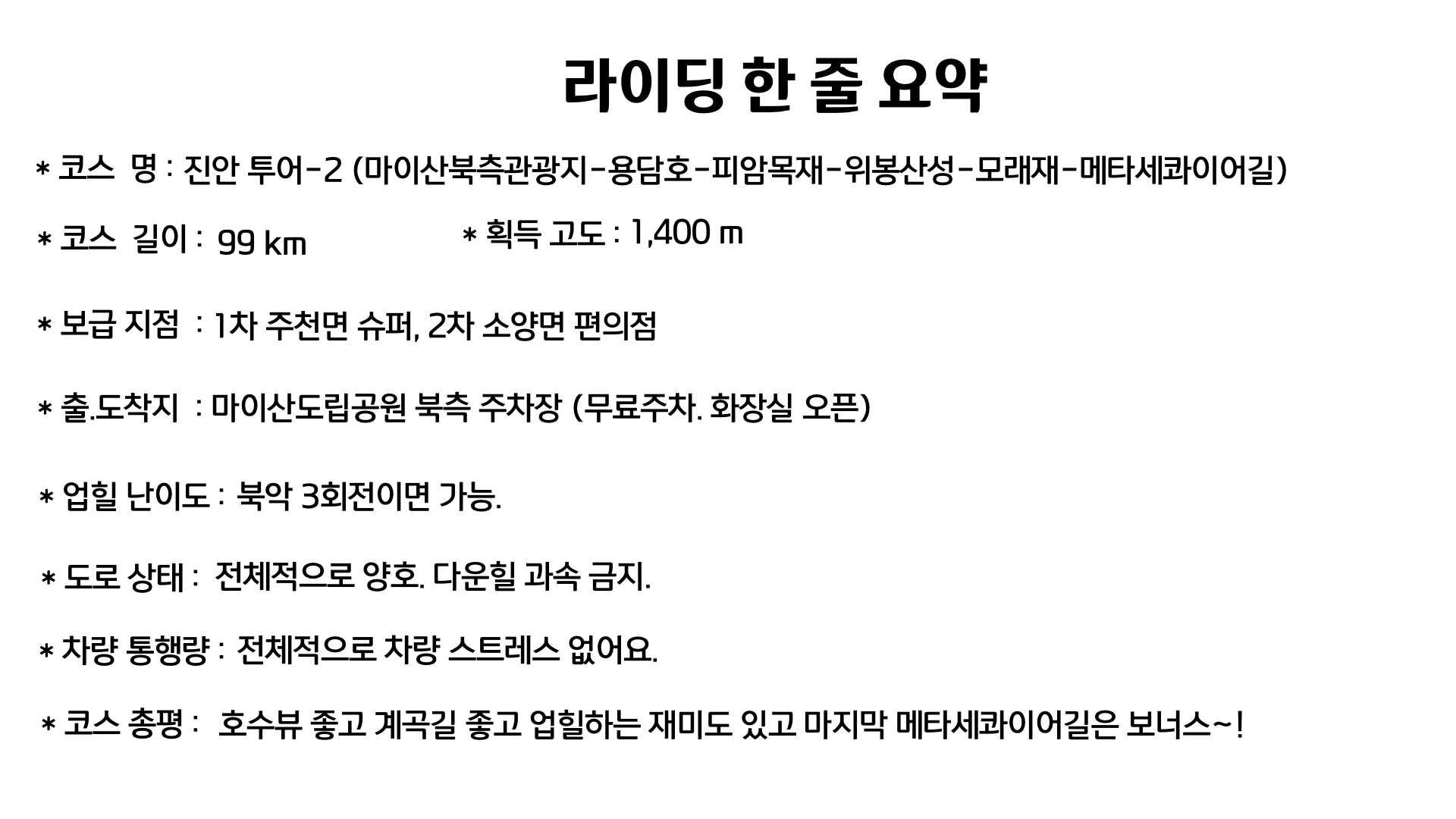 진안-마이산 투어때 가지 못한 모래재의 메타세콰이어길과 위봉산성 포토포인트 그리고 금산라이딩때 고생했던 피암목재를 지나 용담호로 복귀하는 코스로 잡아봤습니다. 대략 99km, 1,500m 예상합니다.