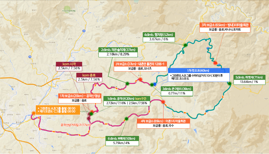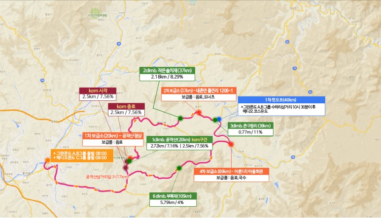 적당한 업힐 3개와 라이딩 거리가 있기때문에 평소 투어라이딩 보다는 조금 난이도가 있으나 대회 분위기에서 오는 에너지와 풍부한 중간 보급점이 있기에 무난하게 재미난 라이딩이 가능하리라 생각됩니다.