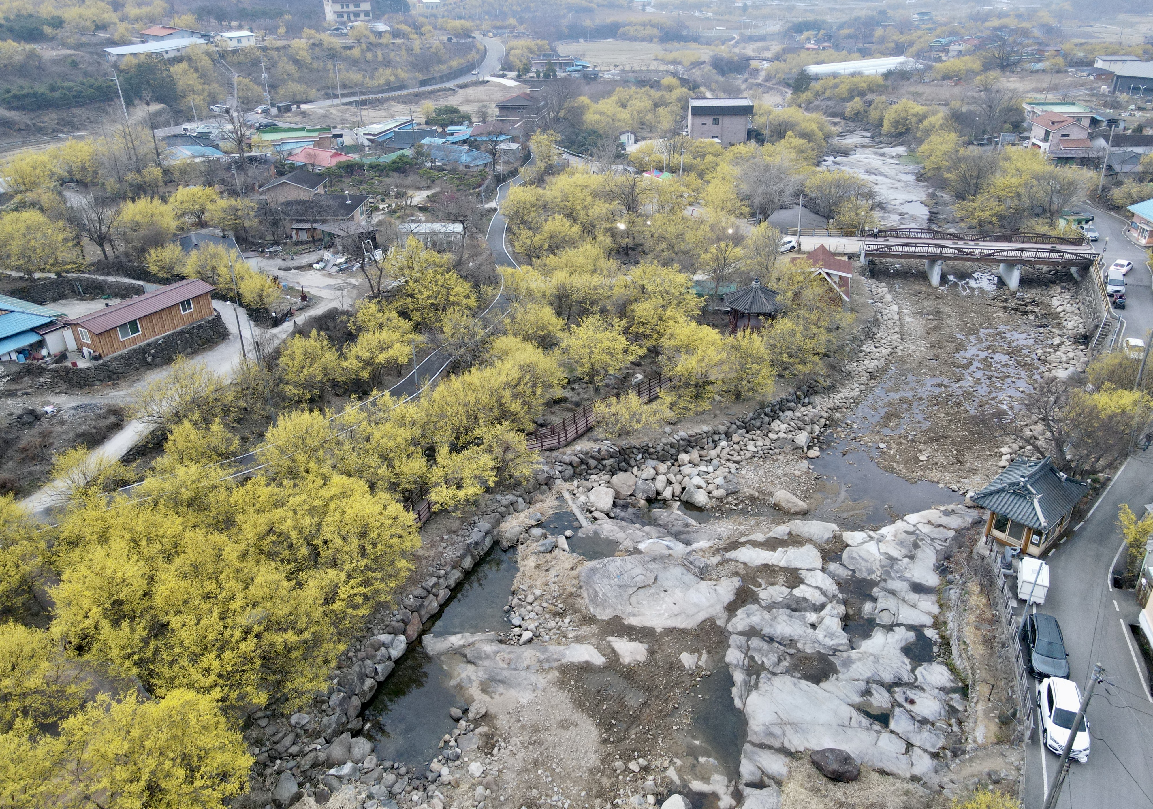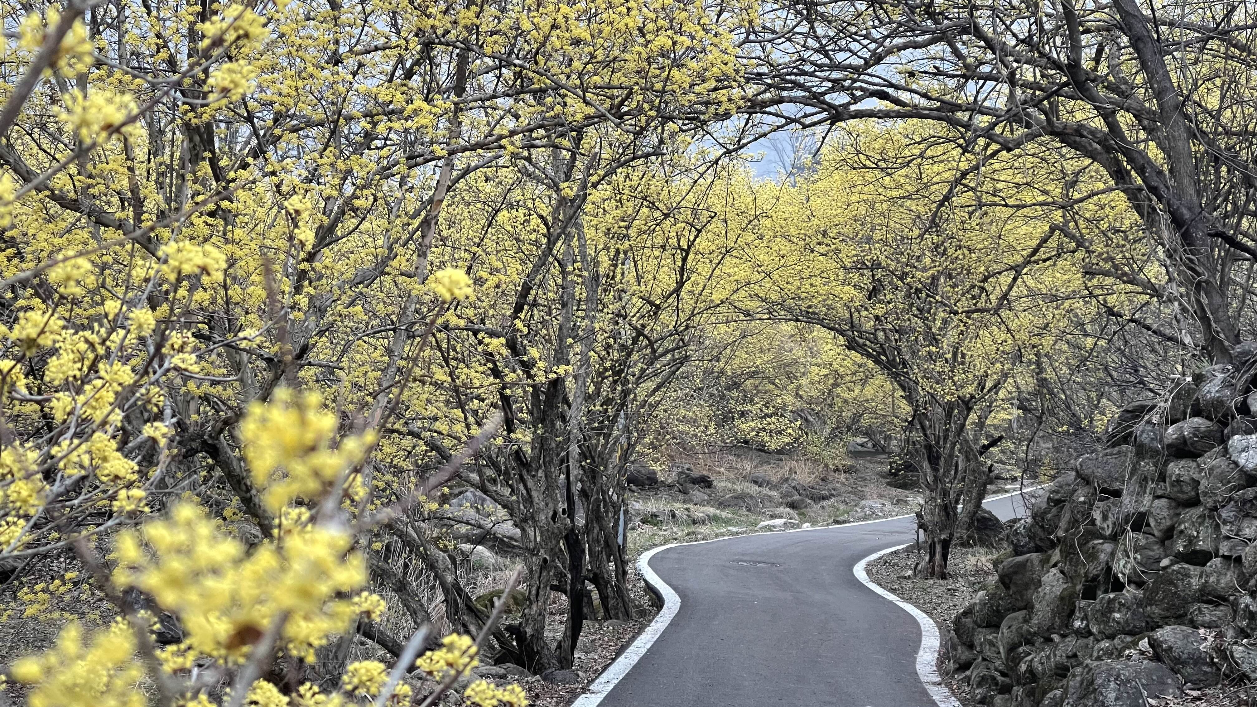 서시천의 바위와 노란 산수유꽃이 어우러진 예쁜 풍경의 반곡마을에서는 사진을 꼭 찍으시고 이후 하위마을 거쳐 상위마을까지는 조금 쎈 업힐이 있으니 산수유 꽃과 함께 천천히 오르시면 됩니다.