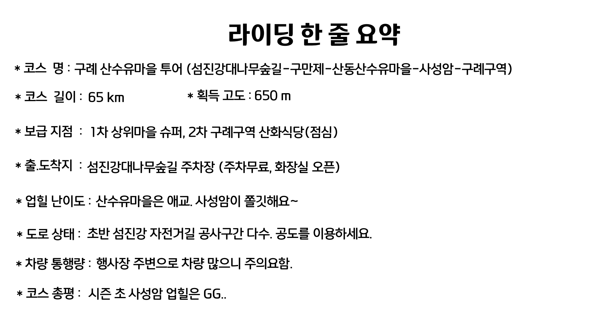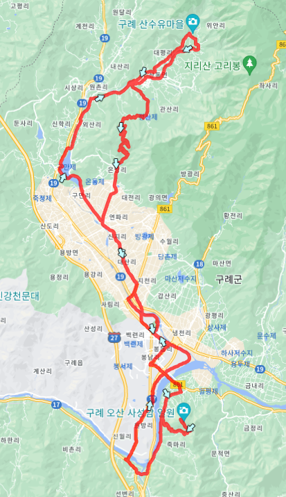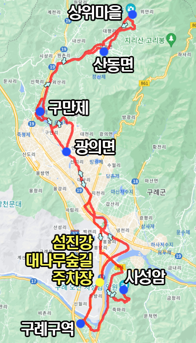 당초 계획했던 코스이니 사성암 업힐 후 체력의 여유가 있거나 라이딩 거리가 짧아 아쉬운 분들은 아래 코스파일 참고해서 좀 더 길게 라이딩하시기바랍니다.