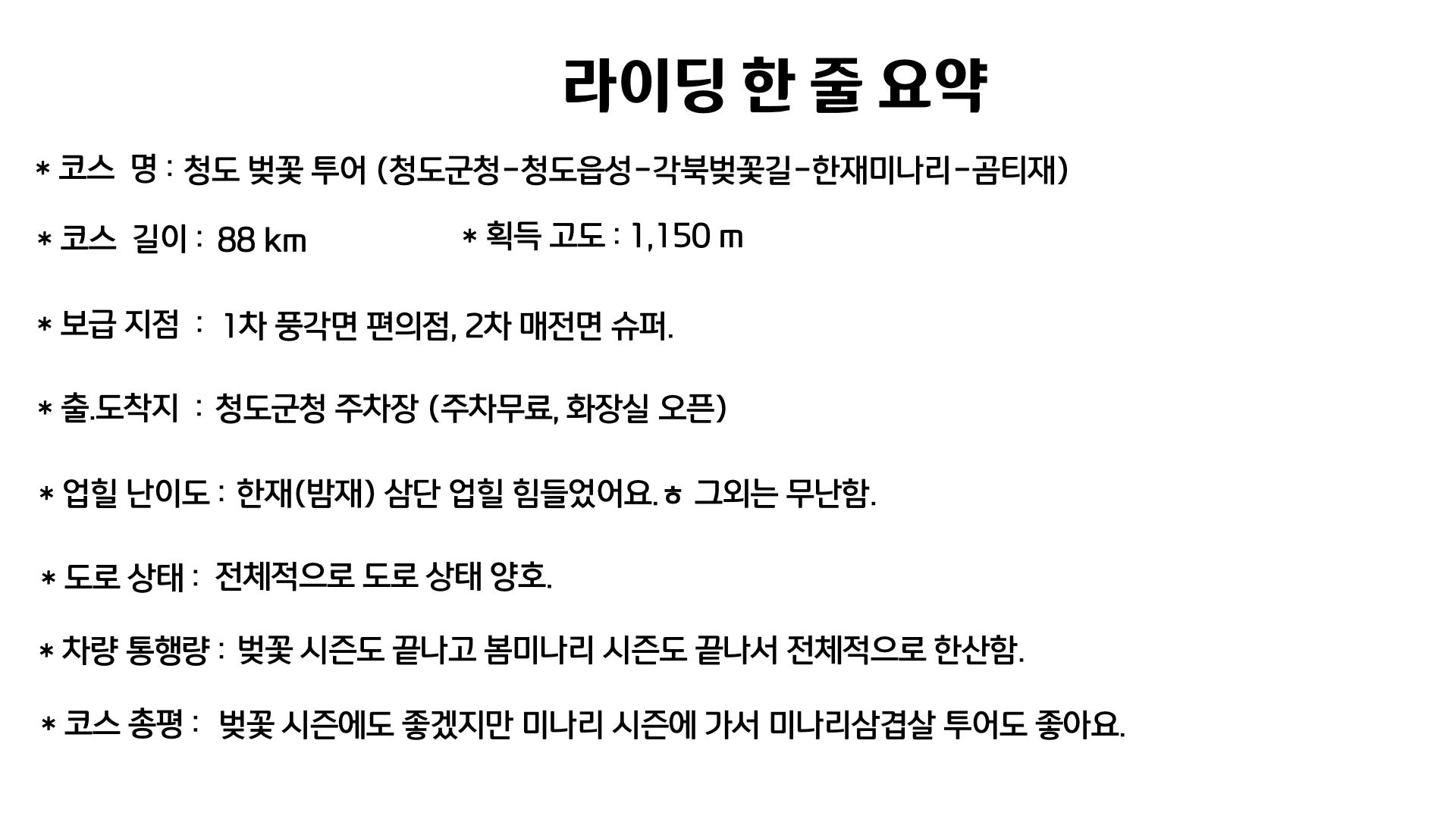전체적으로 한산하고 적당한 업힐과 다양한 볼거리 그리고 신나게 달릴 수 있는 길도 있으니 계절에 상관없이 가볼만한 코스라 생각합니다.