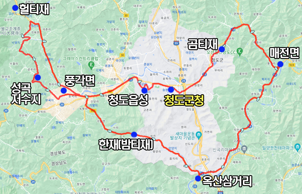 코스는 청도군청에서 출발하여 청도읍성을 구경하고 풍각면과 각북면 사이의 벚꽃길을 지나 한바퀴 돌고 한재(밤티재)를 넘고 운문댐 방향으로 달려 곰티재를 넘어오는 총 88km 1,150m의 코스입니다.
