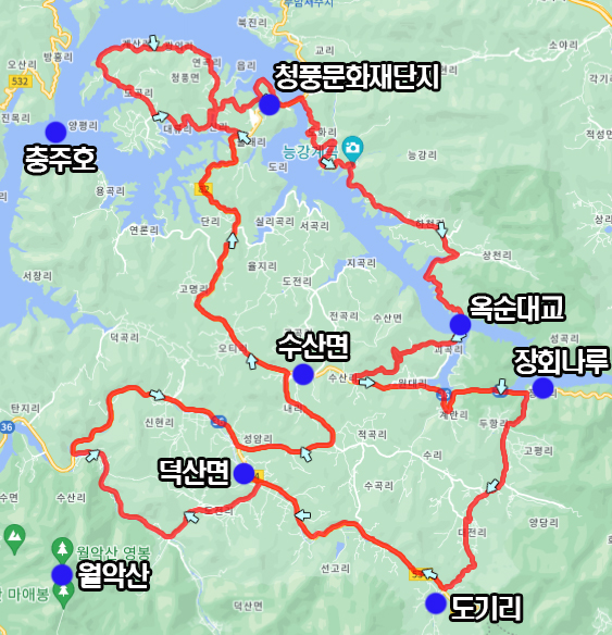 청풍문화재단지 주차장에서 출발하여 옥순대교까지 벚꽃길 라이딩을 하고 이후 장회나루쪽으로 가다 우회전 하여 월악산 자락을 따라 수산면과 덕산면의 한적한 도로를 달리고 이후 청풍면으로 복귀하며 청풍 호반길을 한바퀴 도는 총 85km 1,250m의 코스입니다.