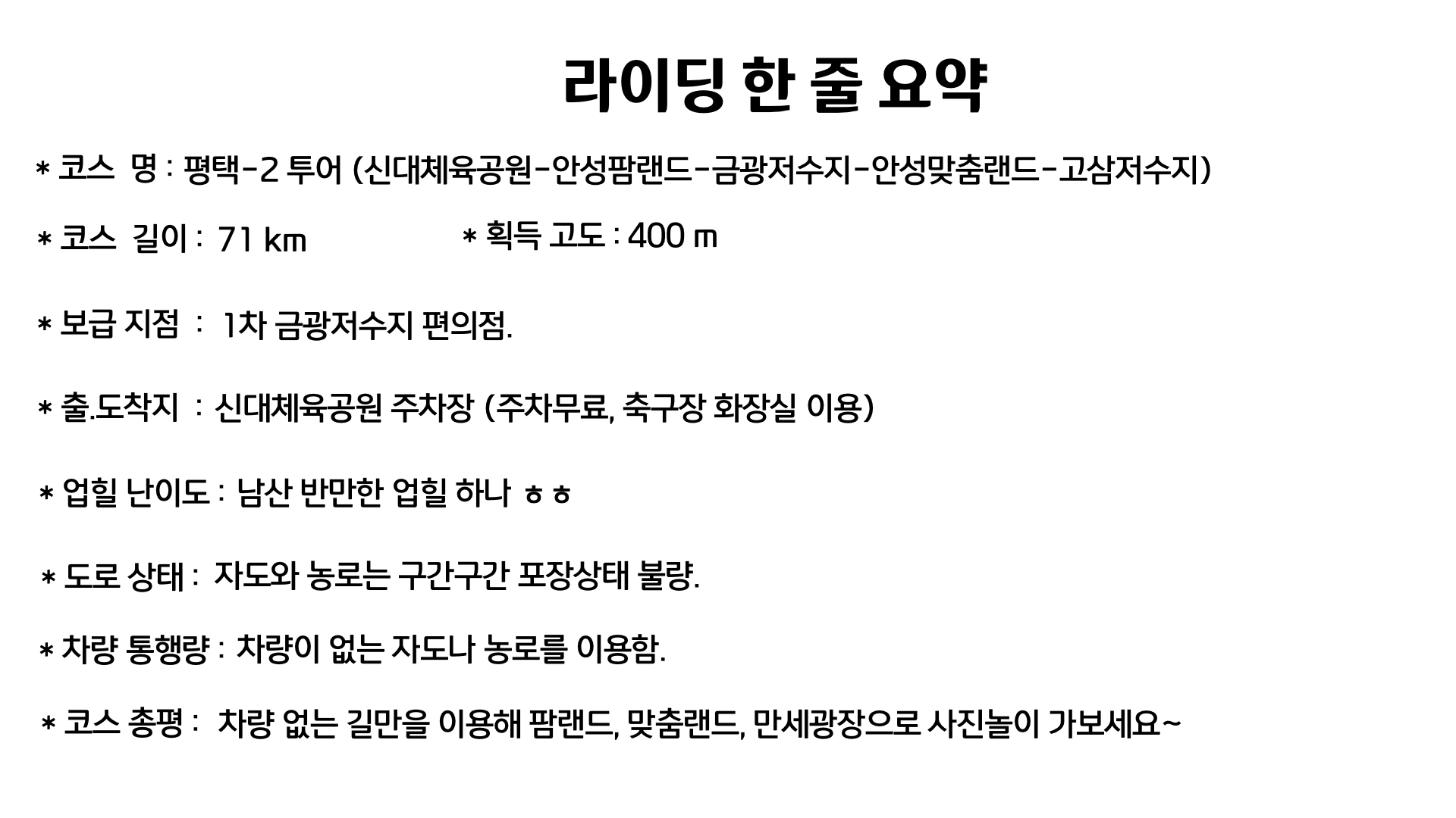 평택 안성 지역에는 산업단지가 많아 도로도 넓고 차량도 많아 공도 라이딩이 쉽지 않은데 이 코스는 안성천 자전거길과 차량통행이 거의 없는 농로등으로 구성해서 비교적 안전하게 라이딩이 가능합니다.