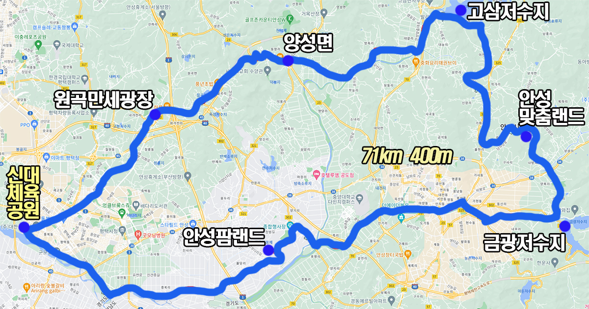 신대체육공원에서 출발하여 안성천 자전거도로와 한적한 농로를 이용하여 안성팜랜드를 거쳐 금광저수지 앞으로 해서 안성맞춤랜드와 고삼저수지를 지나 양성면을 거쳐 복귀하는 총 71km 400m의 코스입니다.