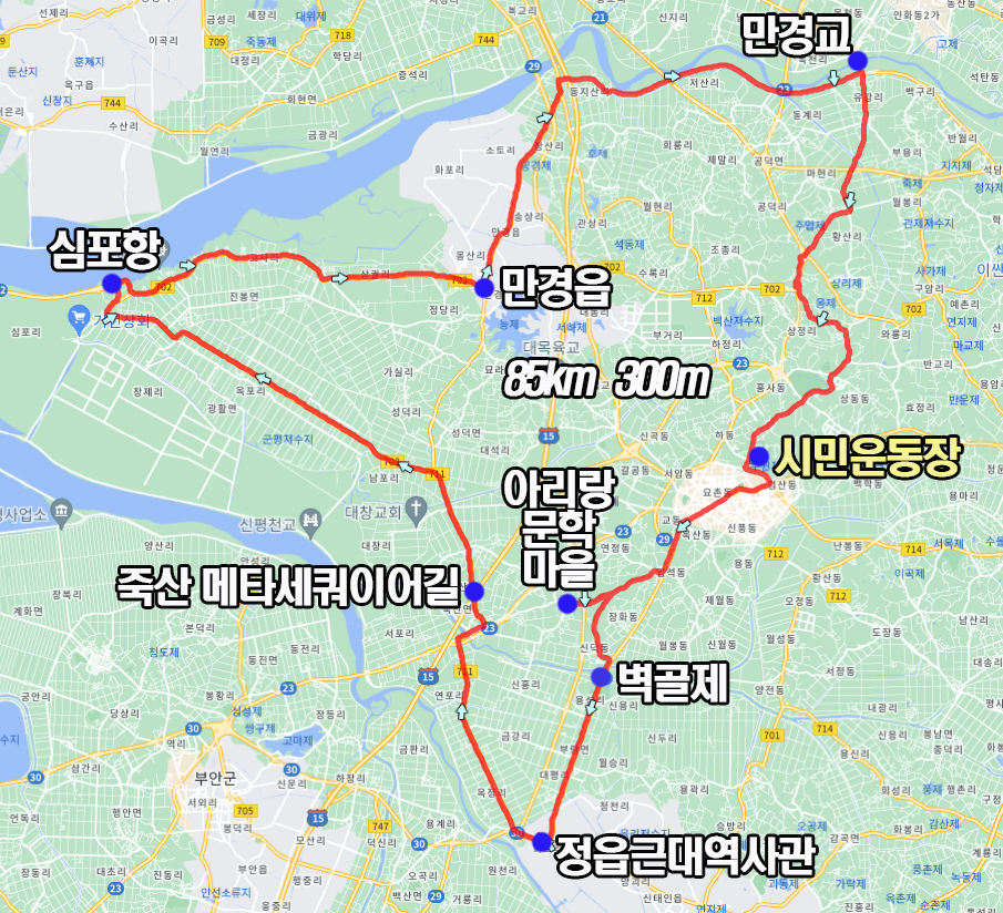 한적한 만경강 강변길을 달려 만경교에서 우회전하여 시민운동장까지 복귀하며 라이딩을 마무리합니다.