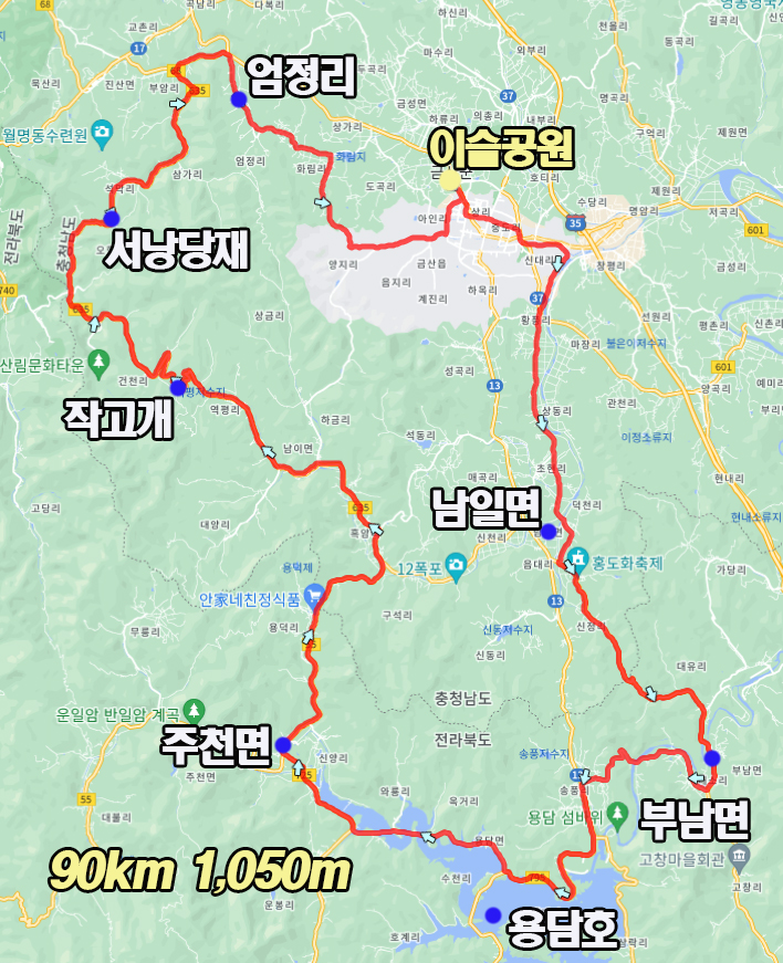 금산읍 이슬공원에서 출발하여 무주군 부남면을 거쳐 용담댐을 오르고 용담호 호반길을 잠시 달려 주천면 - 작고개 - 서낭당재를 넘고 출발지로 복귀하는 총 90km 1,050m의 코스입니다.