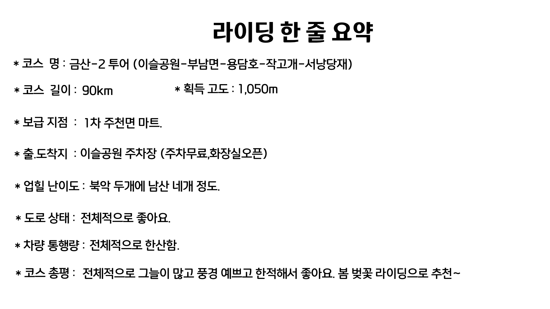 이 코스는 전체적으로 그늘진 곳이 많아 여름철 라이딩으로 추천드립니다.