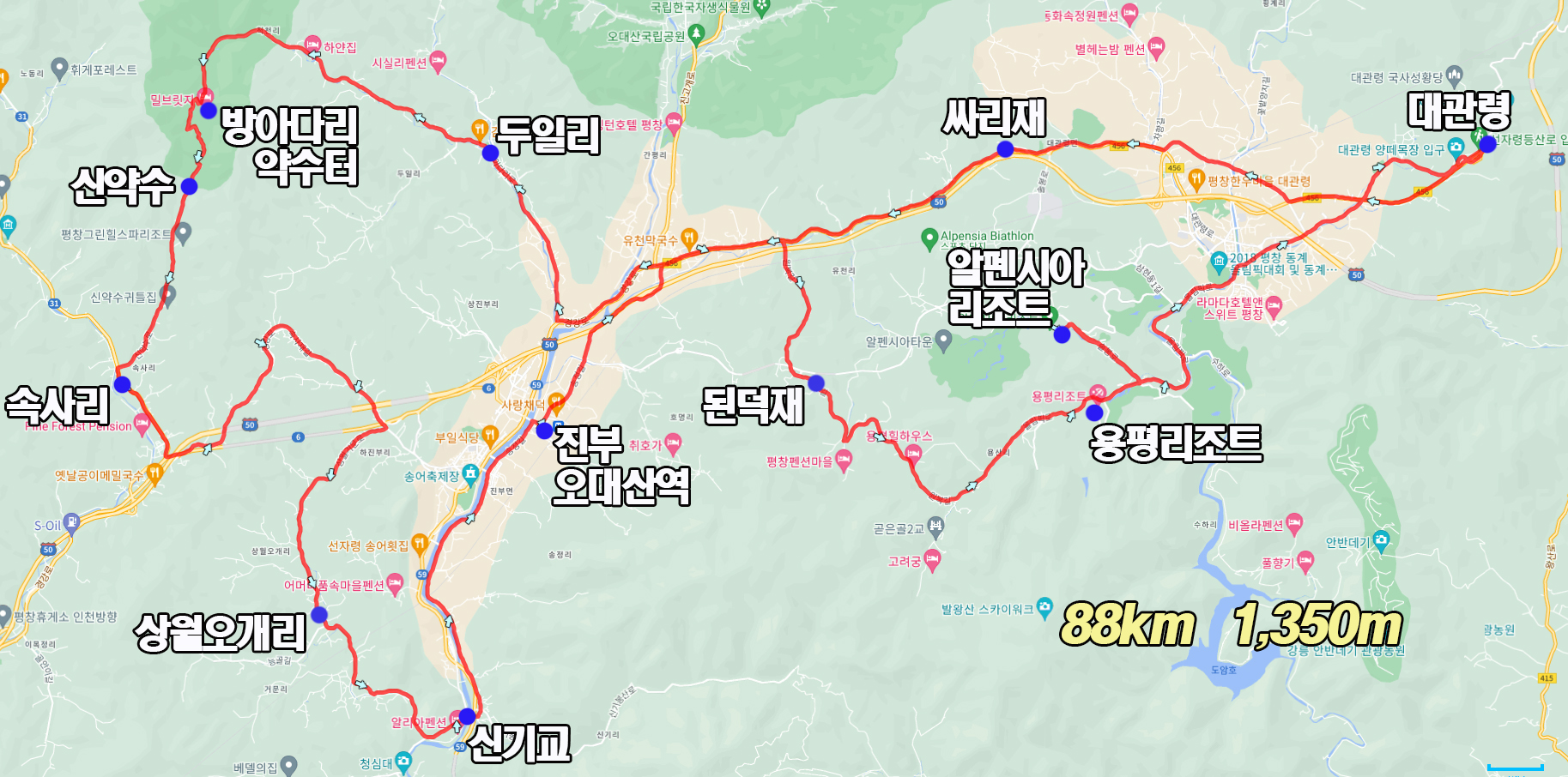 속사리고개를 넘어 진부로 가다 우회전하여 상월오개리를 거쳐 신기리 입구로해서 진부오대산역 앞을 통과해 싸리재 방향으로 가다 유천리 방향으로 우회전하여 오산리 된덕재를 넘고 용평리조트 앞으로 해서 출발지로 복귀하는 코스입니다.
