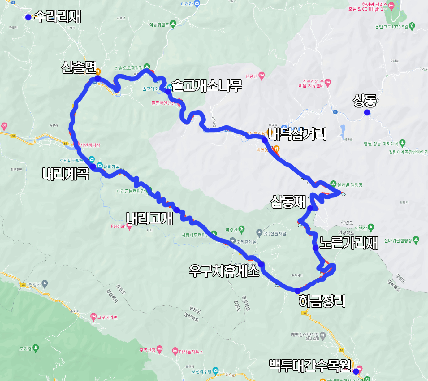 덕구천을 따라 덕구리로 내려오면 상동에서 영월 나가는 국도를 만나고 이후로 산솔고개 소나무를 지나고 산솔면으로 복귀하면 됩니다.