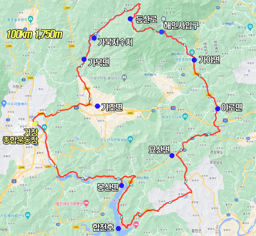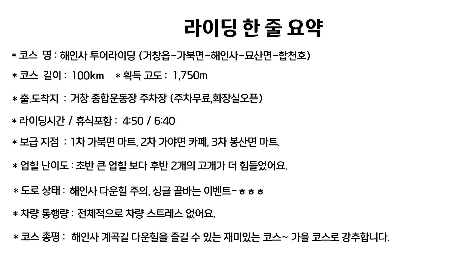 오늘은 가야산의 해인사 계곡길을 달릴 수 있는 100km 1,750m의 투어코스입니다.
