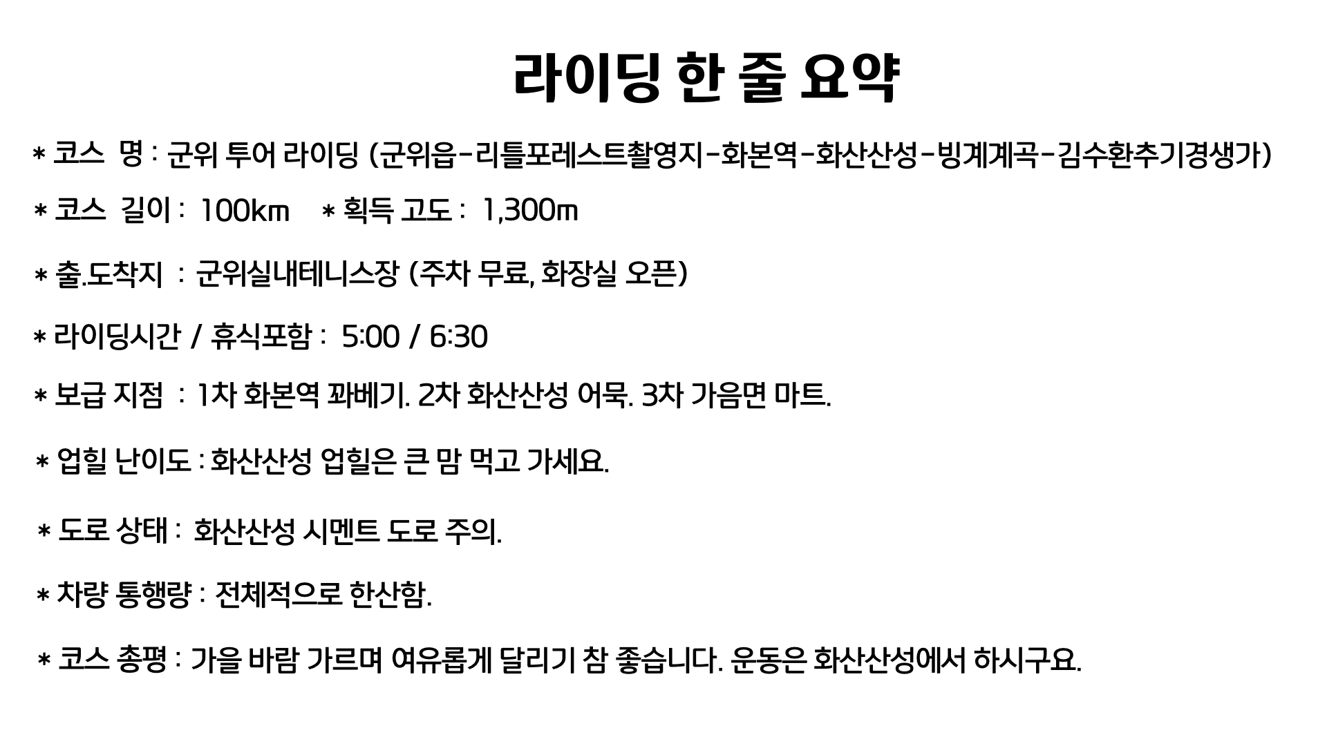 오늘은 군위라이딩으로 예전부터 가보고 싶었던 리틀포레스트 촬영지와 화본역 화산산성을 엮어서 만든 총 100km 1,300m의 코스입니다.