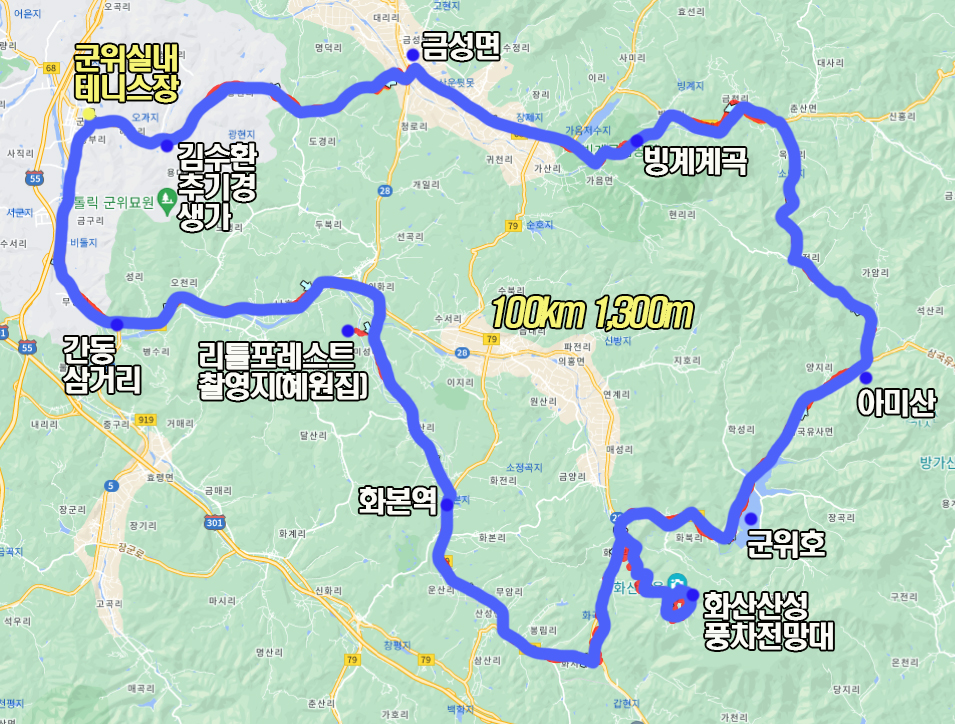 혹시나 업힐은 힘들어 빼고 싶은 분은 화산산성을 빼고 만든 아래 87km 코스로 다녀오셔도 좋을듯합니다.