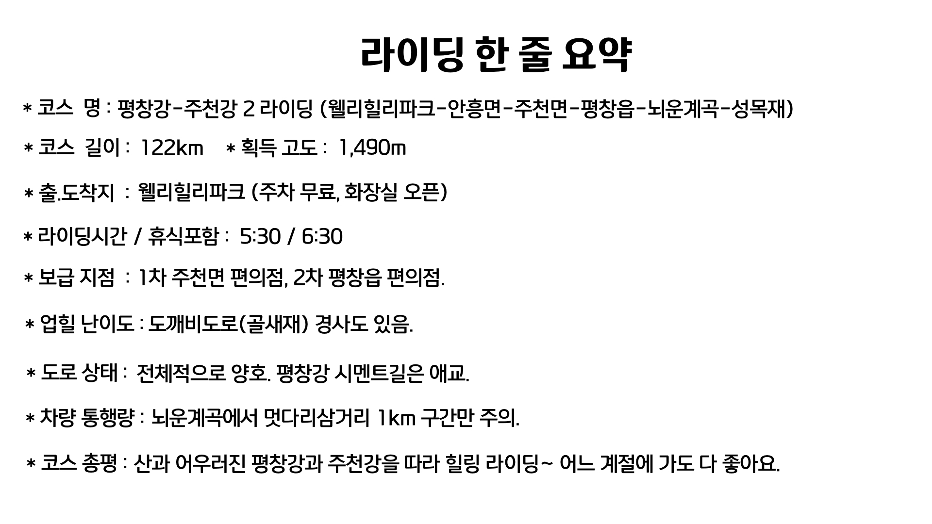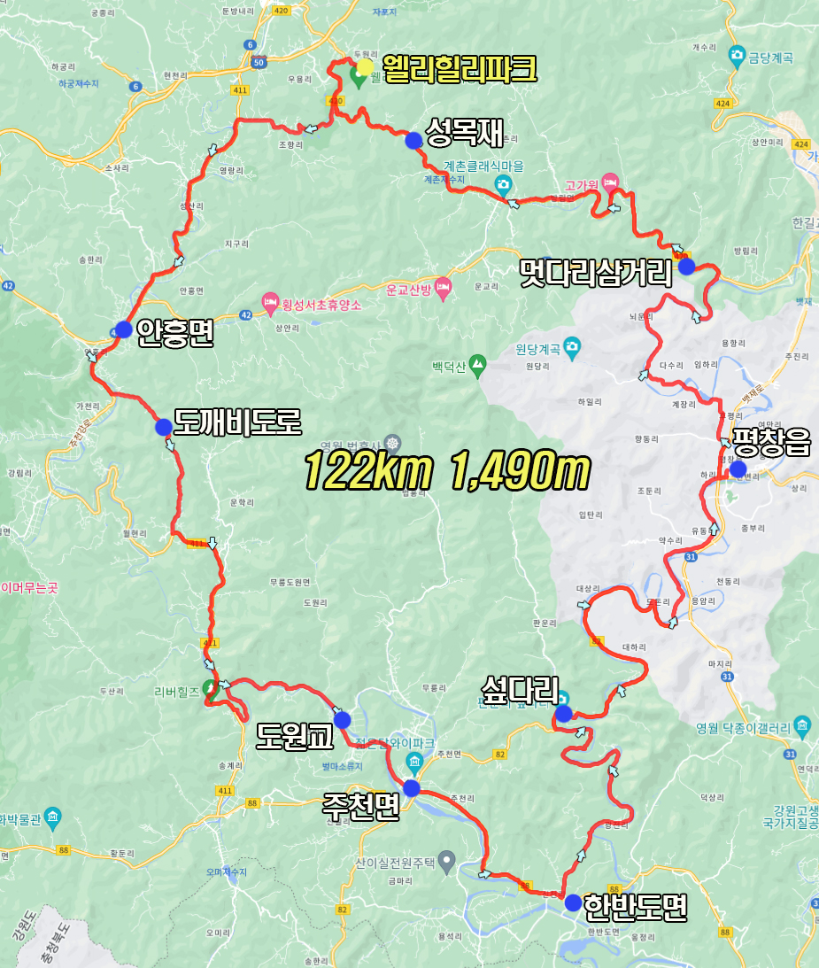 가을 단풍라이딩으로 평창강과 주천강변 길을 달리는 122km 1,490m의 투어라이딩 대표 코스입니다.