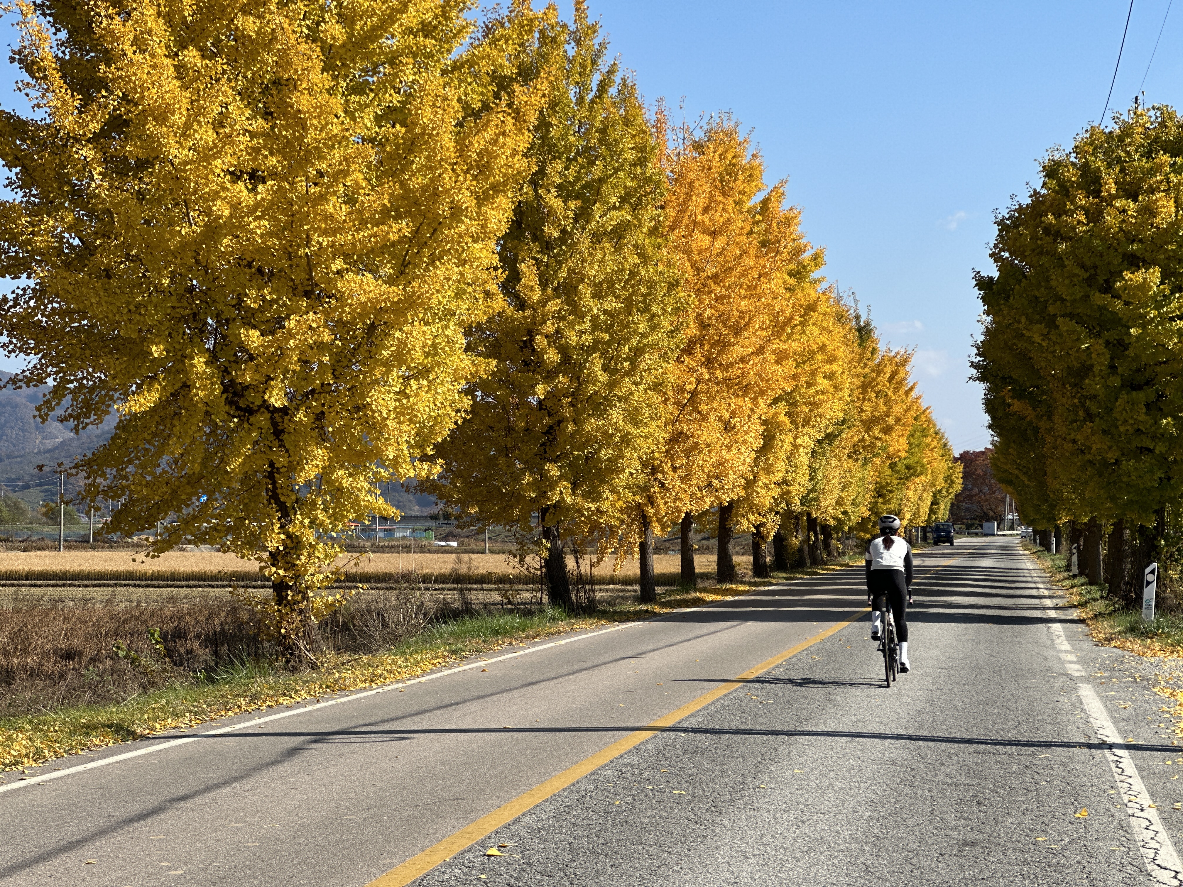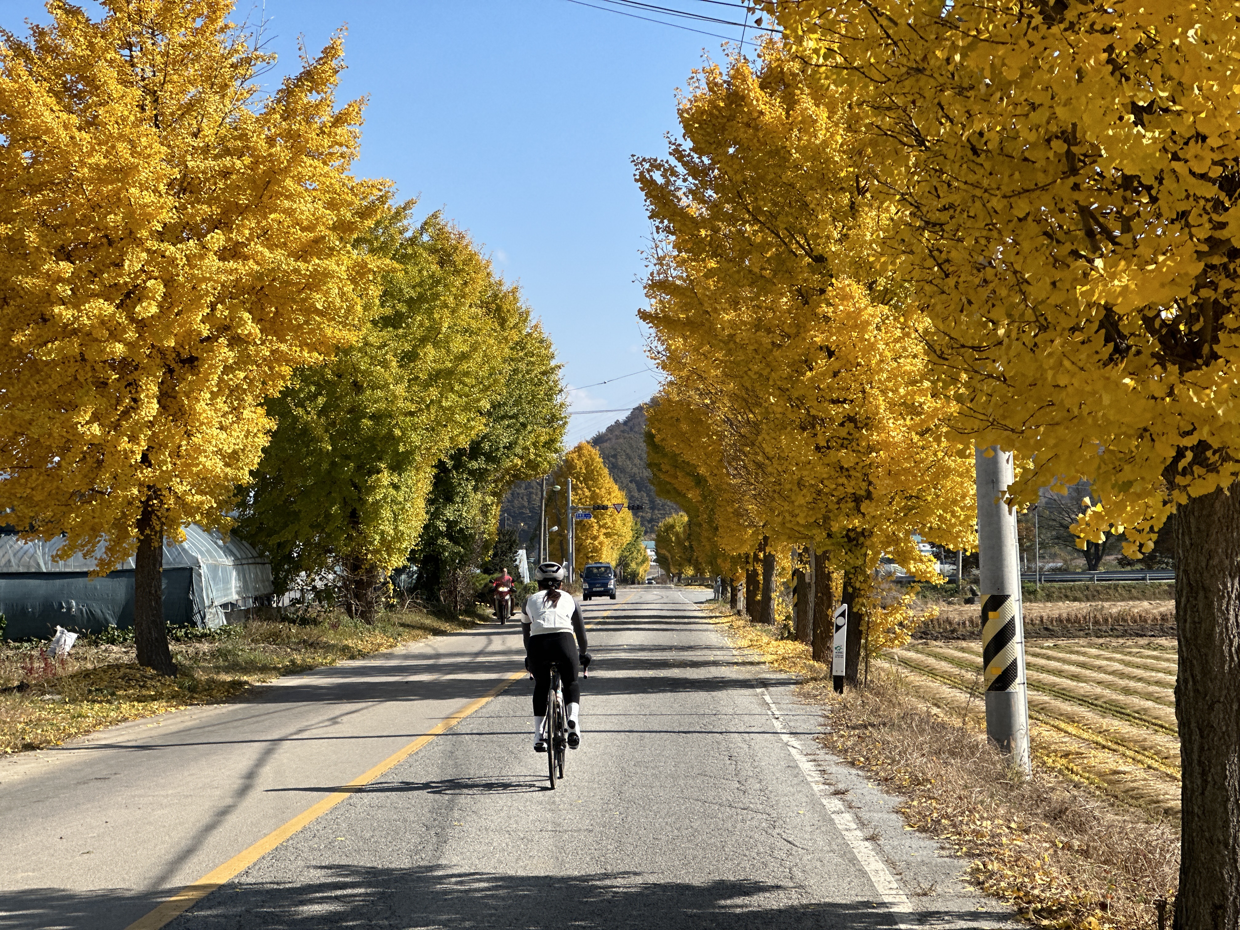 소이면에서 다시 달천방향으로 달려 대간치로 가는데 이 길에는 은행나무 가로수가 물들어 참 예뻤습니다.