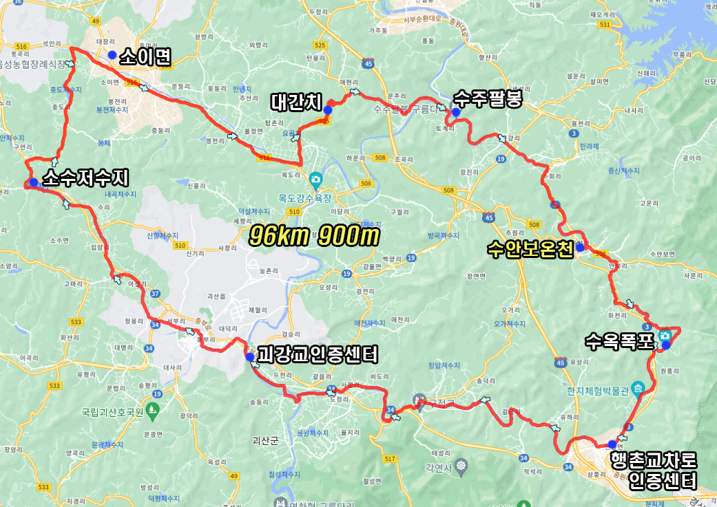상류의 쌍천을 따라 가다 달천을 만나 괴강교인증센터를 지나고 성황천변길을 잠시 달려 괴산을 관통하고 한산한 도로를 이용해 소수저수지를 지나 음성군 소이면으로 달립니다.