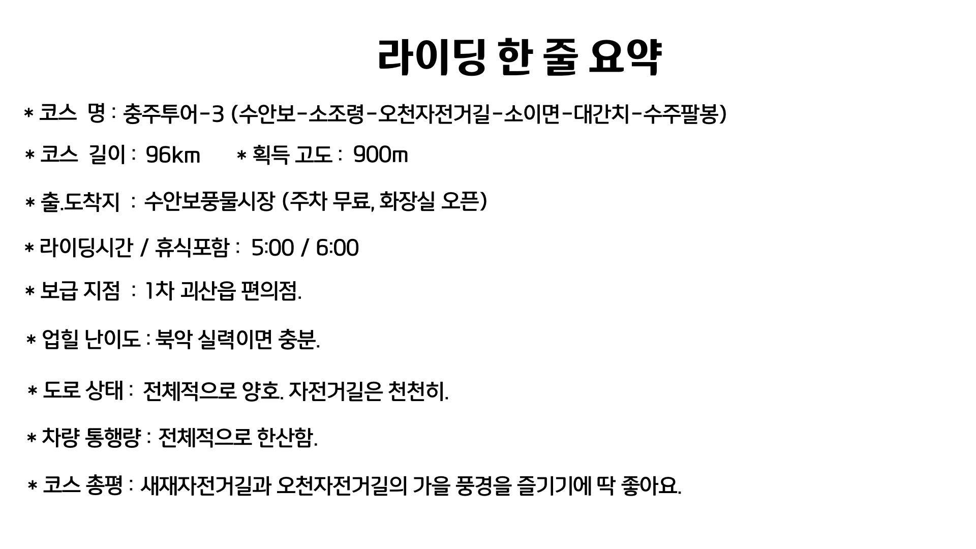 오늘은 가을 단풍라이딩으로 수안보에서 출발하여 새재자전거길인 소조령을 넘고 오천자전거길을 이용해서 천변길을 달리고 음성군 소이면으로 해서 대간치를 넘고 수주팔봉으로 해서 복귀하는 총 96km 890m의 코스입니다.