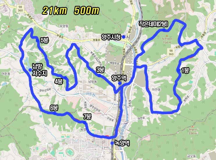 양주역 부근의 작은테미산을 포함해서 7개의 낮은 산을 타는 싱글 초보코스로 21km 500m의 코스입니다.