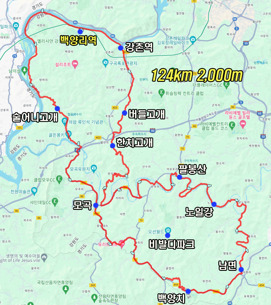 이후 강촌IC 앞을 지나 마지막 고개 버들고개를 넘어 출발지로 복귀하는 124km 2,000m의 조금은 힘든 코스였습니다.