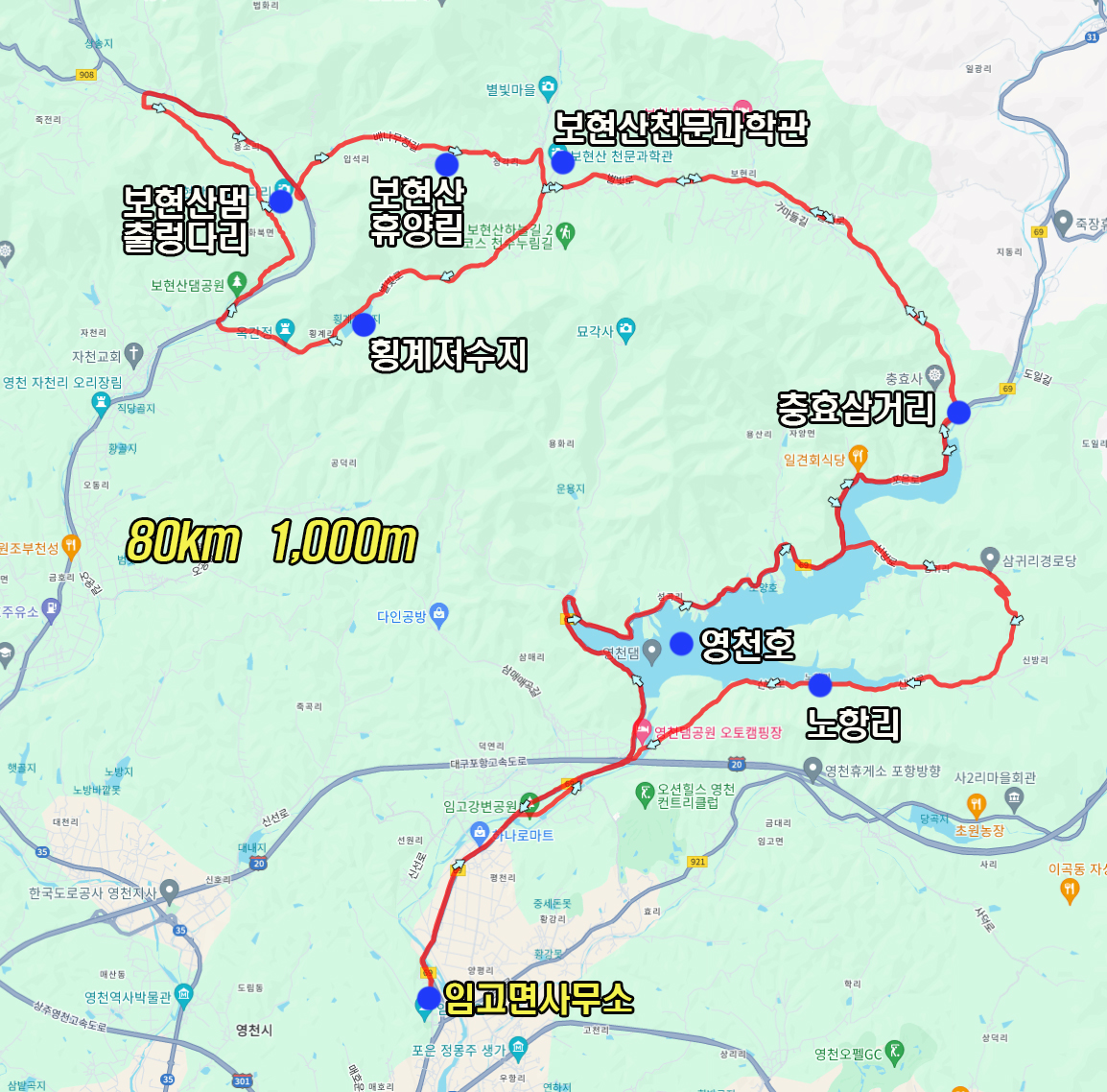 영천호 중간에서 다리를 건너 호수 반대쪽 노항리를 거쳐 출발지로 복구하는 80km 1,000m의 코스입니다.
