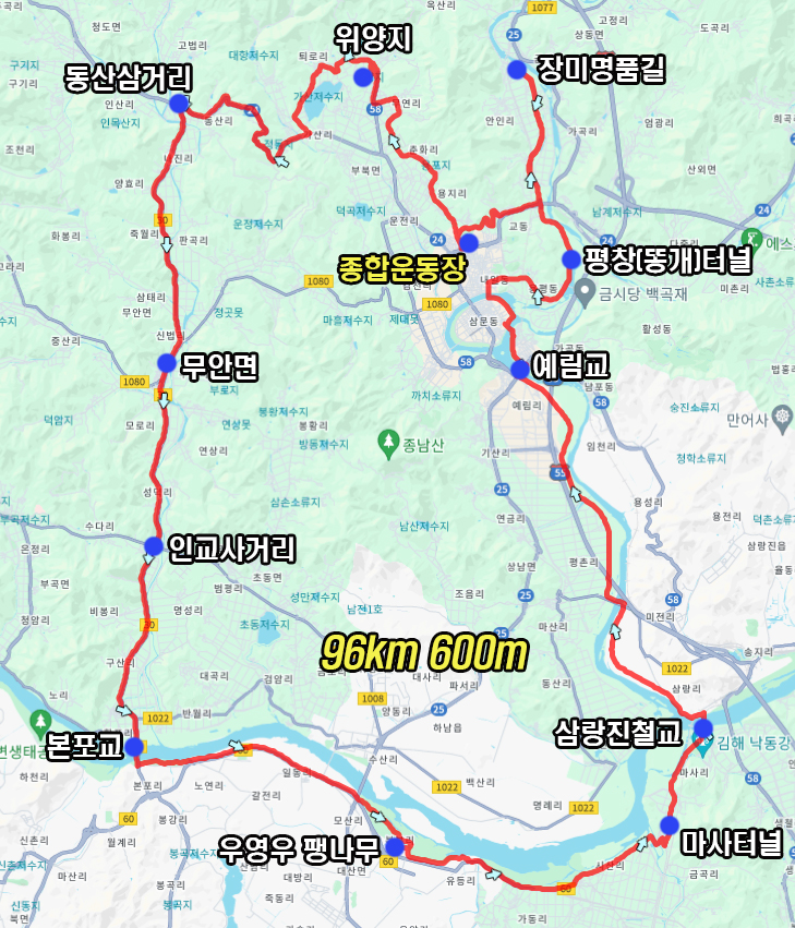 출발은 종합운동장에서 했으며 첫 목적지로 위양지 들렀다 나와 밀양재를 넘고 낙동강 방향으로 달려갑니다.