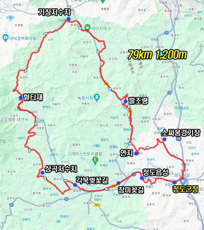 청도군청에서 출발해서 대구 자덕들의 성지 헐티재와 팔조령을 돌아오는 79km 1,200m의 코스입니다.
