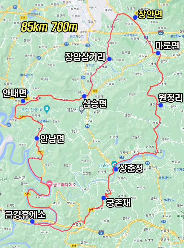 보은군 장안면에서 출발해서 남쪽 방향으로 청산면 상춘정 지나고 궁촌재 넘어 금강휴게소에서 보급 후 금강 상류쪽으로 옥천 향수백리길따라 복귀하다가 정방재를넘어서 오는 85km 700m의 난이도 낮고 풍경 예쁜 투어코스입니다.