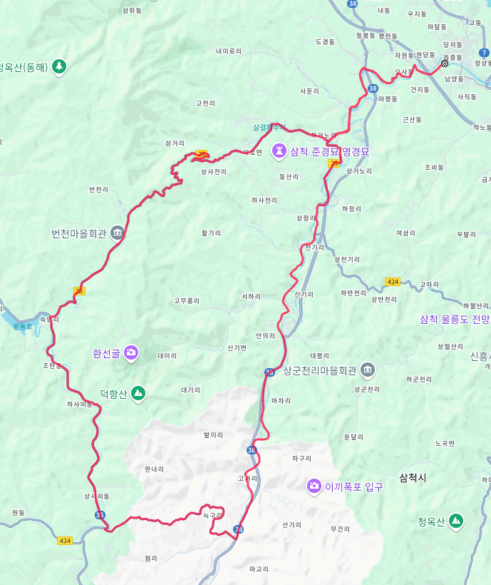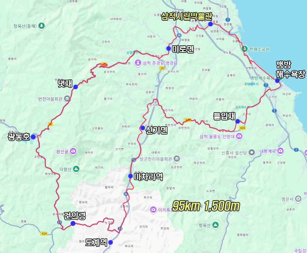 도계로 다운힐 후엔 삼척방향으로 고사리 마차리, 신기면을 지나고 복귀길은 맹방해수욕장 방향으로 달려 들입재를 넘어서 오는 코스로 잡았습니다. 이 구간은 어라운드삼척 그란폰도 코스의 일부입니다.