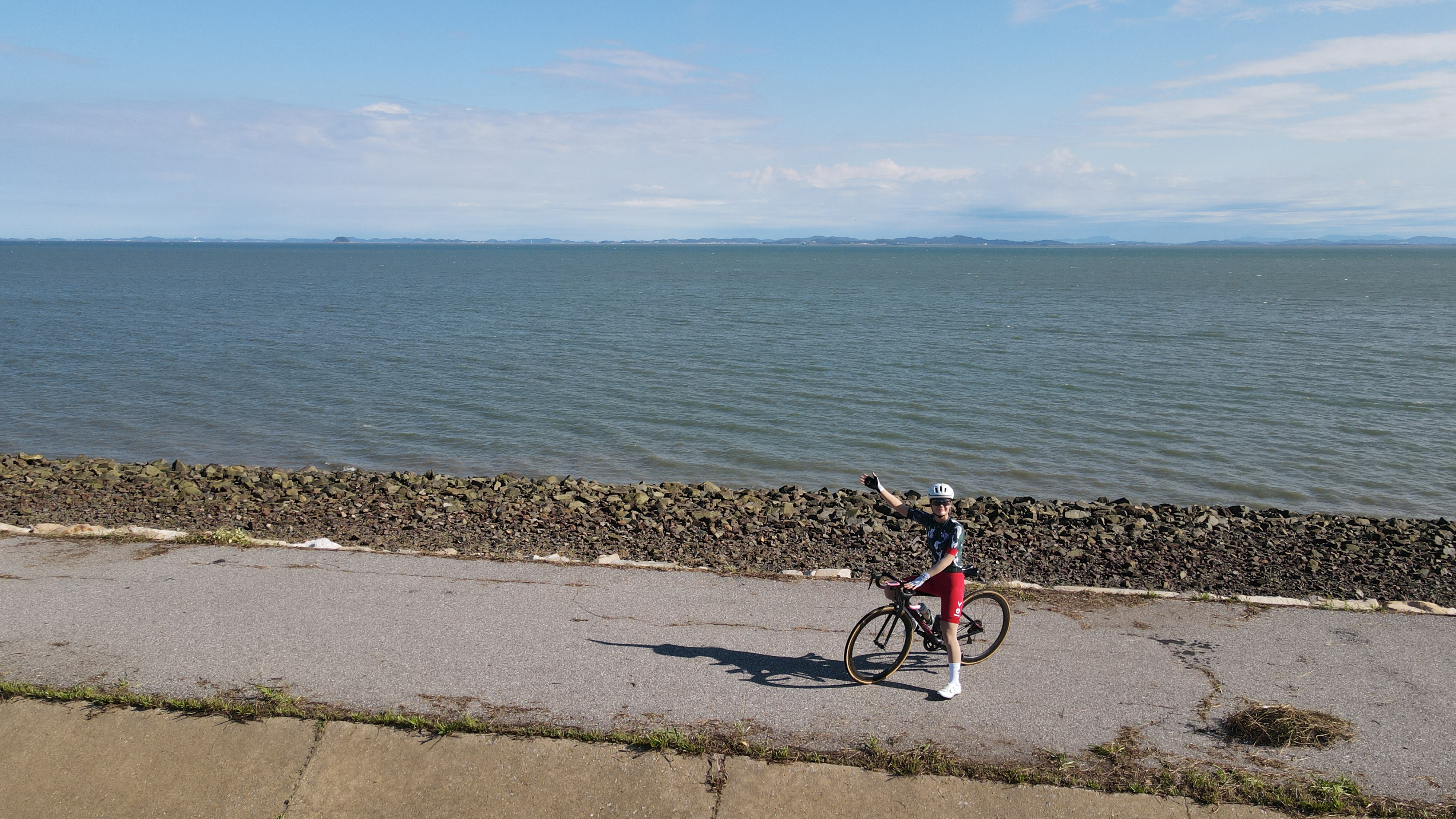 쭉 뻗은 방조제길을 신나게 달리기도 하고 중간에는 방조제 위로 올라 뚝방길에서 바다를 배경으로 사진도 찍고 건너갑니다.