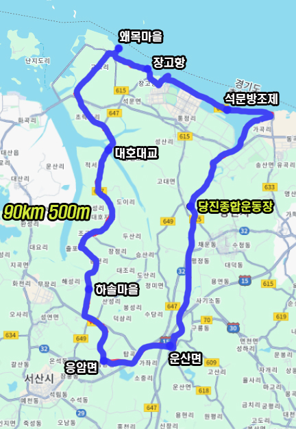 오늘은 당진 라이딩으로 고대면 종합운동장에서 출발하여 석문방조제를 지나고 장고항과 왜목마을 해안가를 들러 보고 내륙으로 들어와 대호지면을 지나고 운산면을 거쳐 복귀하는 89km 500m의 코스입니다.