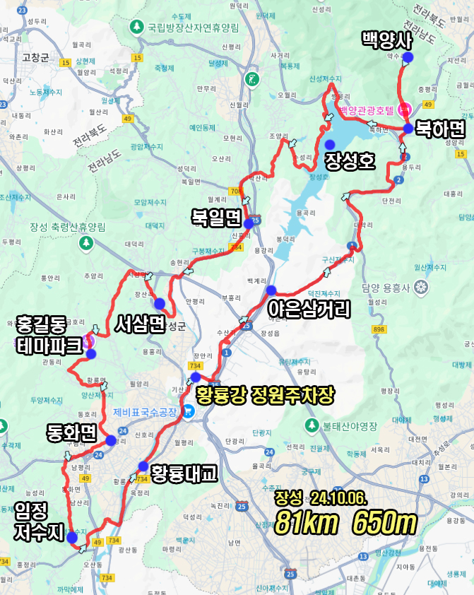 오늘은 황룡강변의 가을꽃과 단풍 명소인 백양사를 돌아보는 81km 600m의 코스입니다.