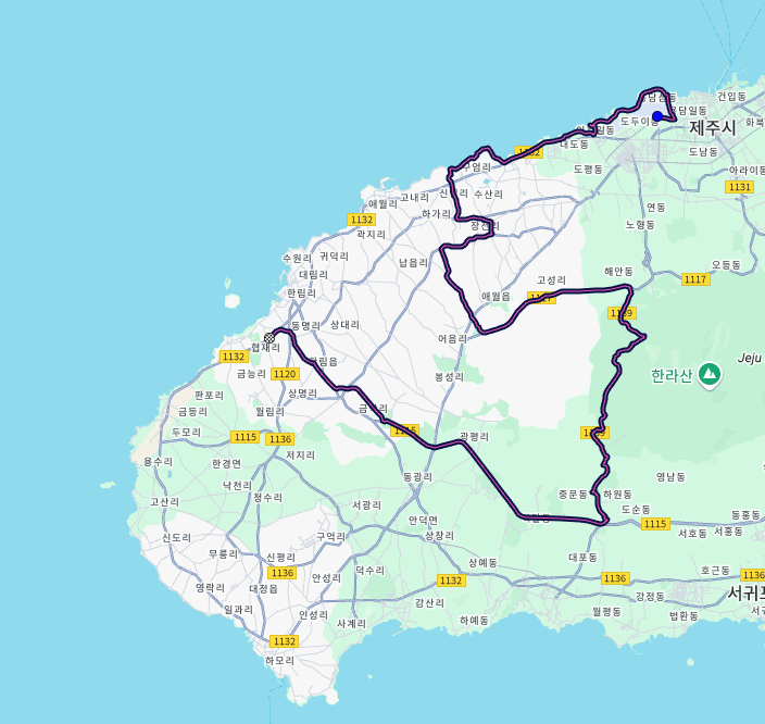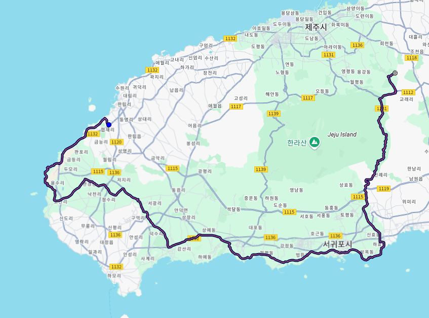 1일차는 공항에서 출발하여 해안자전거길을 이용해 이호테우해변과 구엄리염전을 지나고 내륙으로 들어가 장전리벚꽃길을 지나 계속해서 중산간도로를 이용해 1100도로를 넘고 산록남로로 해서 한림으로 다운힐하는 88km의 코스입니다.