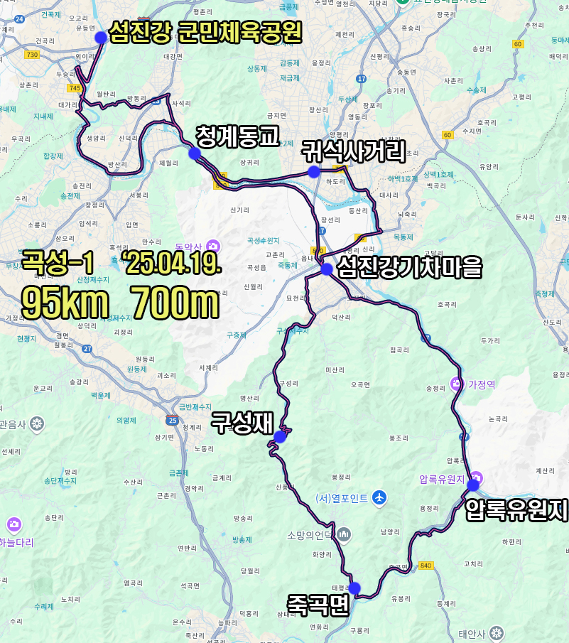 출발은 섬진강자전거길에 있는 순창군 군민체육공원에서 했으며 자전거길을 이용해 청계동교까지 달리고 이후엔 공도를 이용해 곡성까지 달립니다. 이 구간은 한적하고 강과 어우러진 풍경이 예뻐서 참 좋았습니다.