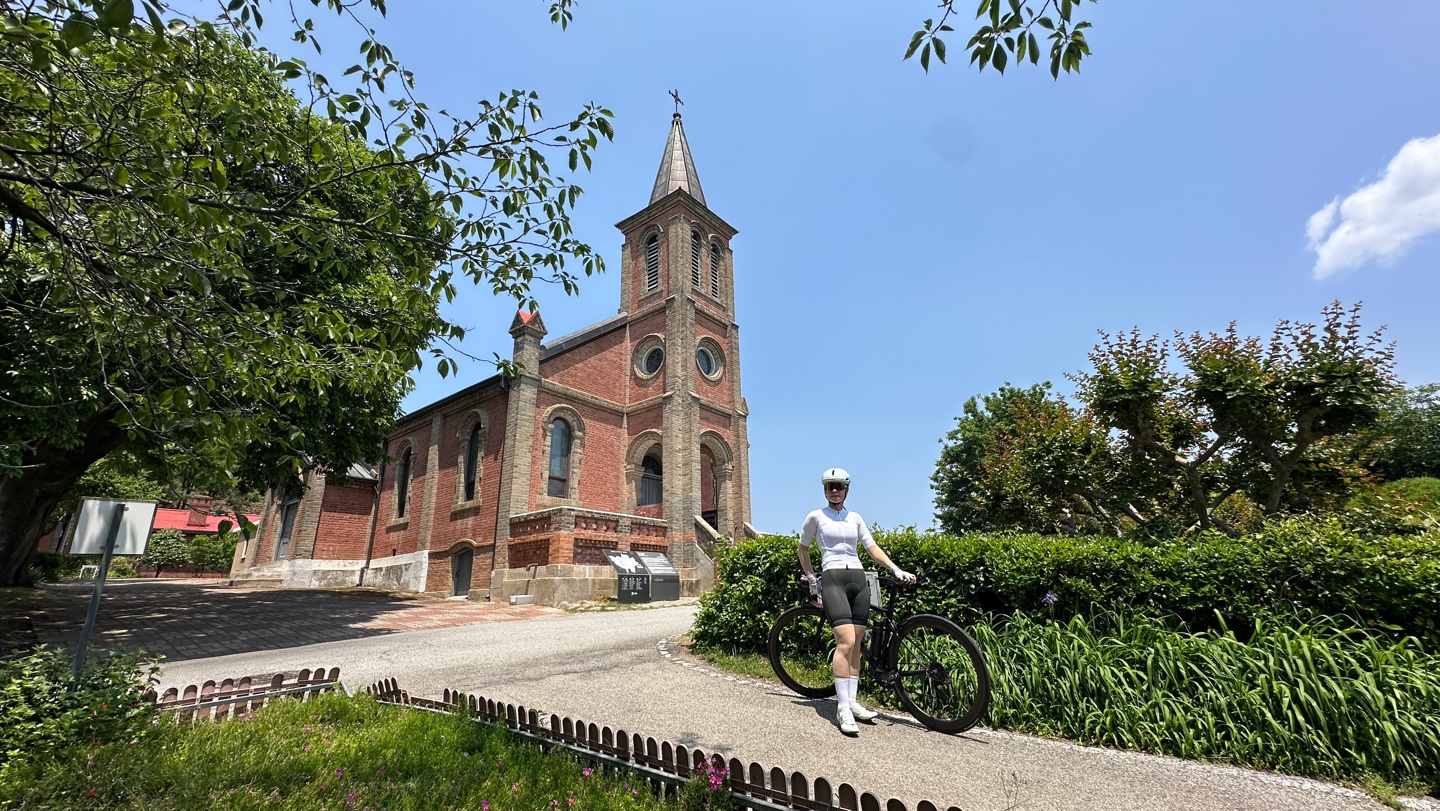 낙동강 자전거길에 들어선 이후로는 중간중간 끝없이 펼쳐진 금계국 군락지를 지나고 얼마 전 인기있었던 드라마 "폭싹속았수다"에서 아이유(금명)의 결혼식 장면에 나왔던 가실성당에 들러 인증사진을 찍고 왔습니다. 가실성당은 경북에서 처음 생긴 성당으로 유럽풍의 옛 성당인데 작지만 아기자기 예쁜 성당이었습니다.