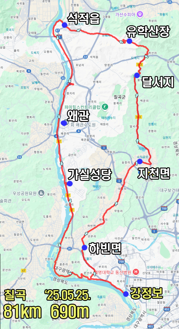 대구 라이더의 대표 집결지 중 하나인 강정보에서 출발해 황학산과 유학산을 넘어 구미방향으로 다운힐 후 낙동강 자전거길을 이용해 복귀하는 81km 690m의 코스입니다.