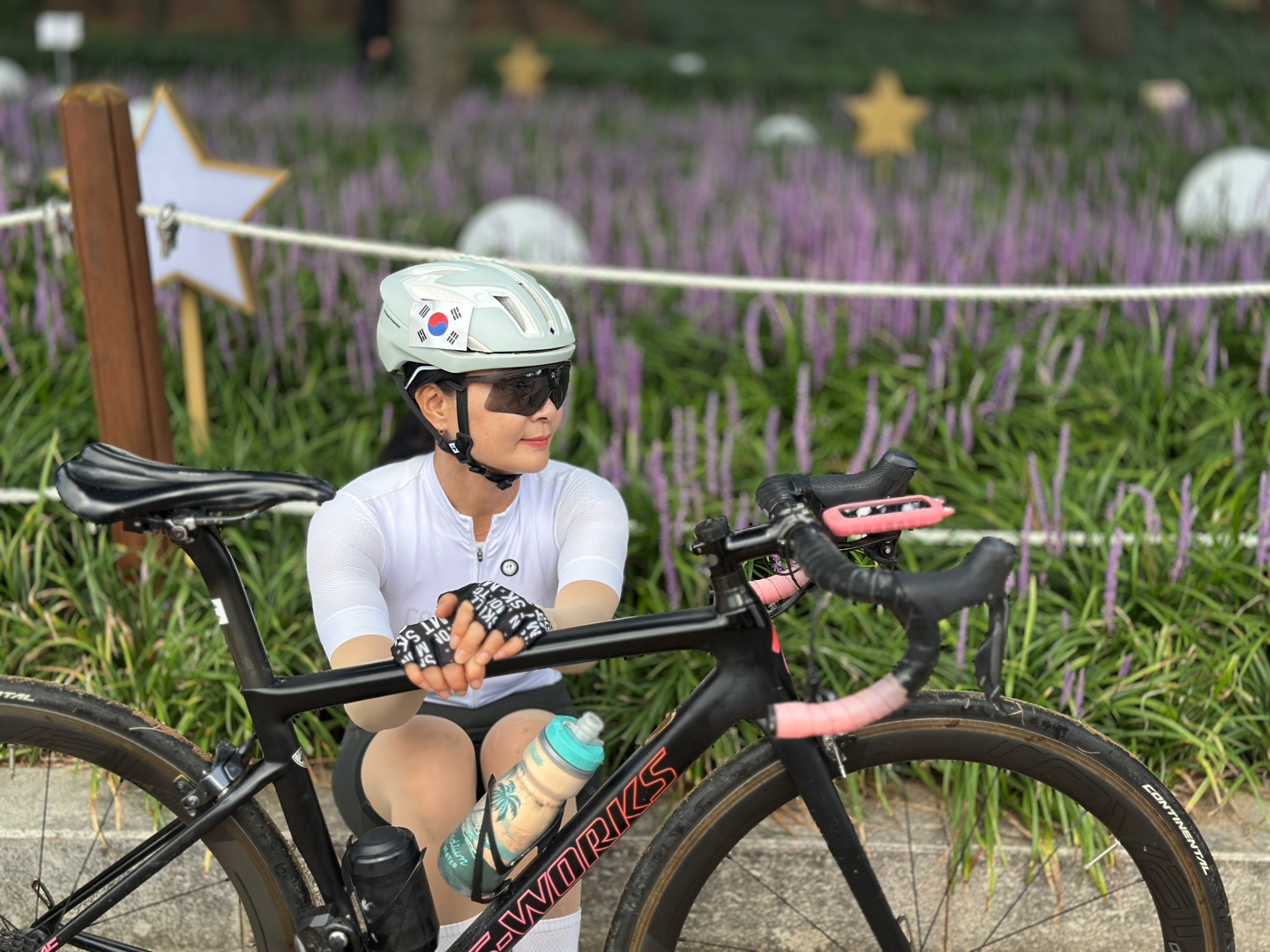 출발은 장항송림자연휴양림 제3주차장(송림동화)에서 했으며 출발 전에 막 피기 시작하는 맥문동꽃을 배경으로 인증샷을 찍고 금강자전거길을 향해 출발합니다.