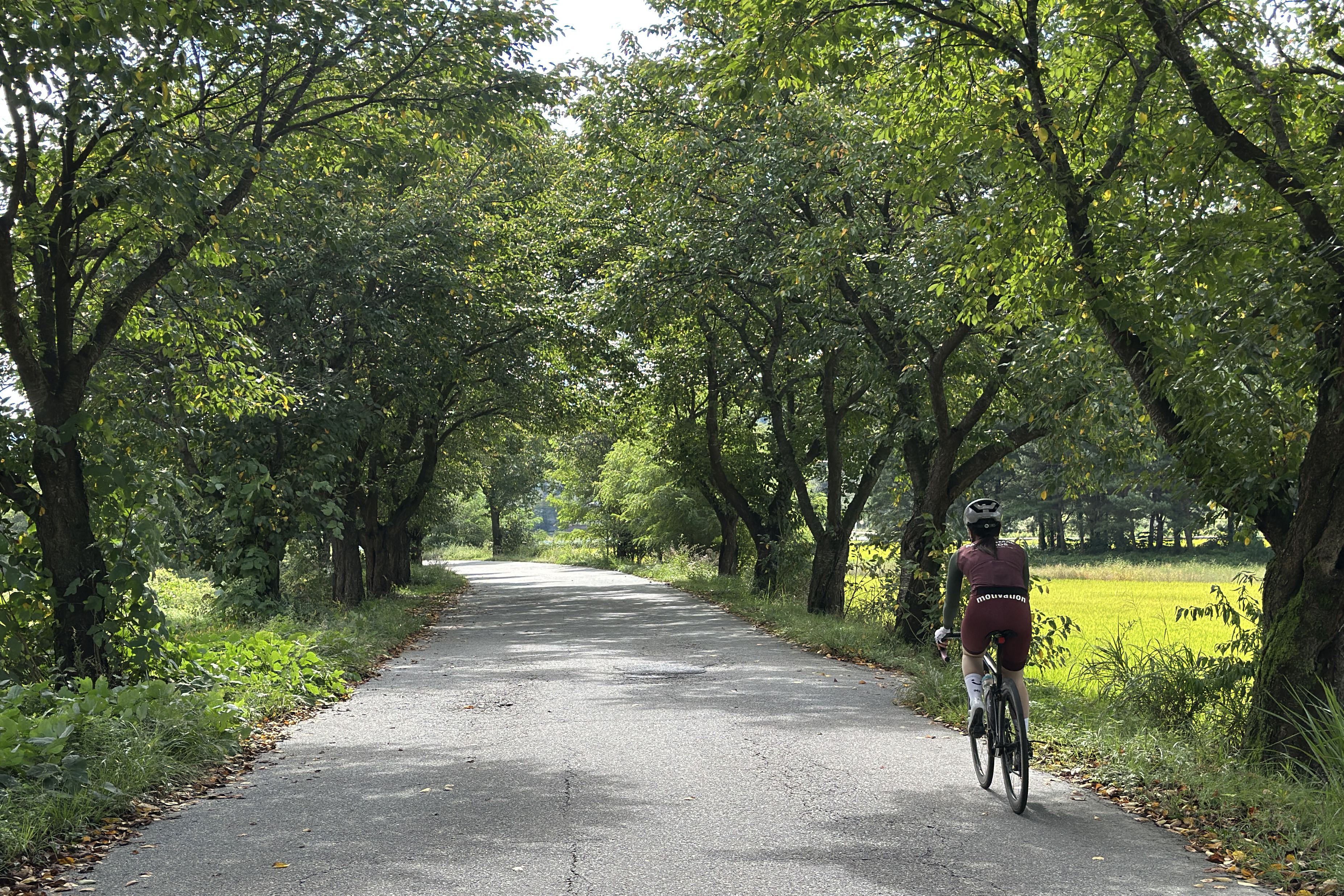 이티재 다운힐 후 한적한 길을 달려 미원면에 도착합니다. 미원면에서는 자전거길을 이용하여 이팝나무 가로수길과 벚나무 가로수길을 달힌 후 다시 한적한 공도로 진입합니다.